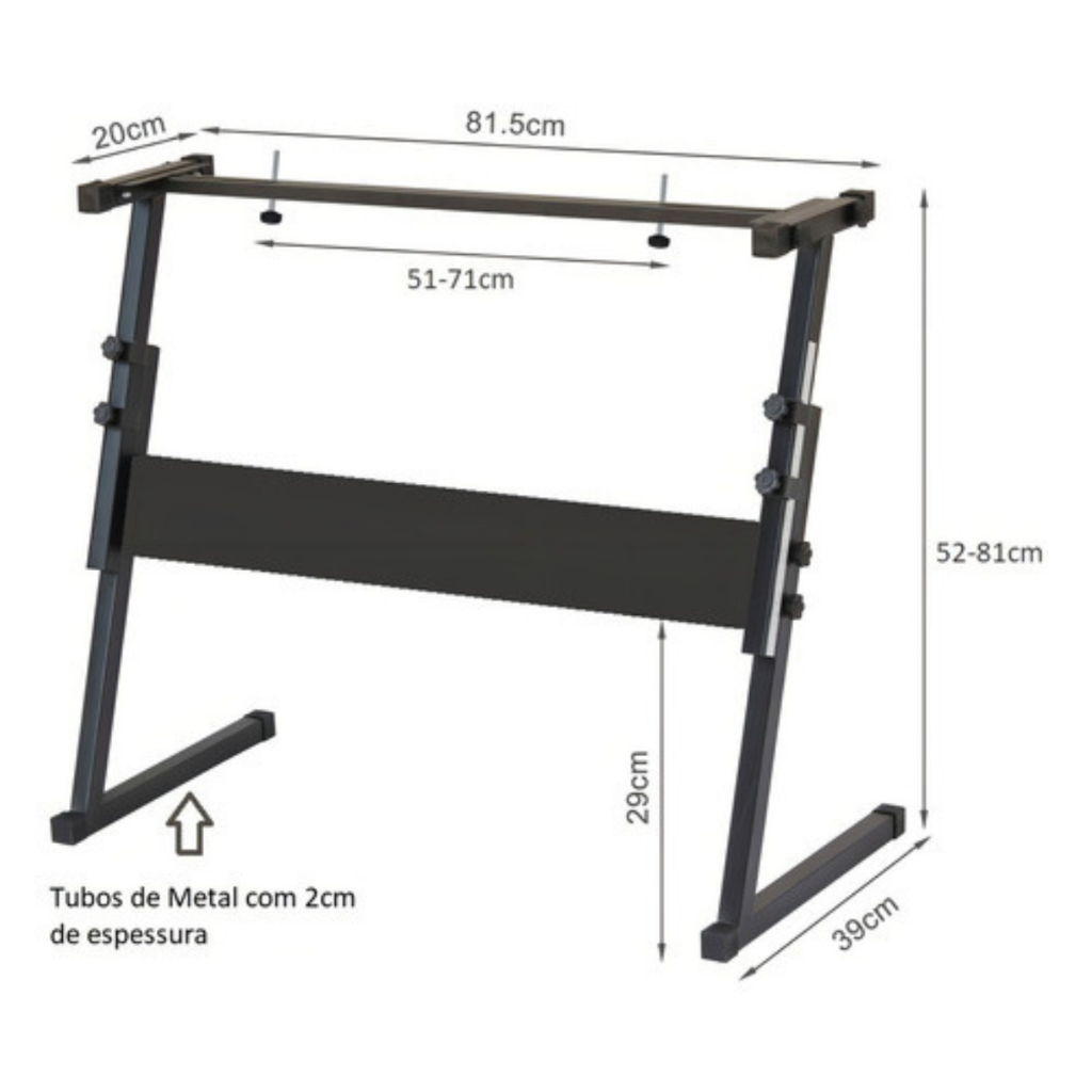 *IMAGENS MERAMENTE ILUSTRATIVAS. O ITEM REFERE-SE SOMENTE AO SUPORTE PARA TECLADO.* ESTABILIDADE ABSOLUTA PARA SUA PERFORMANCE – SUPORTE EM Z REFORÇADO Se você busca segurança real para o seu instrumento, o Suporte em Z é a escolha definitiva. Diferente dos modelos em "X" que podem balançar, o design em Z distribui o peso de forma equilibrada, oferecendo a estabilidade necessária tanto para estudos em casa quanto para apresentações ao vivo. POR QUE ESTE É O MELHOR MODELO DO MERCADO? Segurança Extra: Único com parafusos de fixação direta. Rosqueie seu teclado no suporte e evite quedas acidentais. Liberdade para os Pés: O design aberto permite o uso confortável de pedais de sustain e volume, sem barras atrapalhando suas pernas. Versatilidade Real: Testado para suportar até 40kg, acomodando desde teclados leves de 54 teclas até pianos digitais mais pesados de 61 teclas. Ajuste Personalizado: Altere a altura de 52cm a 81cm com rapidez, permitindo tocar sentado ou em pé com ergonomia total. ESPECIFICAÇÕES TÉCNICAS: Material: Ferro com tubos metalon de 2cm (Alta durabilidade). Capacidade: Suporta até 40kg. Ajuste de Altura: 52cm a 81cm. Acabamento: Pintura epóxi preta com ponteiras antiderrapantes. Peso do Suporte: 2.3kg (Leve para transportar, robusto para usar). O QUE VEM NA CAIXA? 01 Suporte em Z para Teclado/Piano Digital. Bem-vindo à Shop Flex! Na Shop Flex, a música é o que nos move. Somos especialistas em instrumentos e acessórios musicais, oferecendo uma curadoria completa de marcas nacionais e internacionais. Nosso objetivo é atender desde o músico iniciante até o profissional de alto desempenho, com produtos que unem qualidade e o melhor custo-benefício do mercado. Por que escolher a Shop Flex? Experiência 100% Online: Processos otimizados para uma compra segura e rápida. Atendimento Especializado: Nossa equipe acompanha você desde a escolha do produto até o pós-venda. Logística Rigorosa: Seus equipamentos são separados e embalados com o máximo cuidado para garantir que cheguem impecáveis. Presença Nacional: Enviamos para todo o Brasil com nota fiscal e garantia de autenticidade. Na Shop Flex, acreditamos que cada detalhe faz a diferença no seu som. Explore nosso catálogo e descubra por que músicos de todo o país confiam no nosso trabalho!