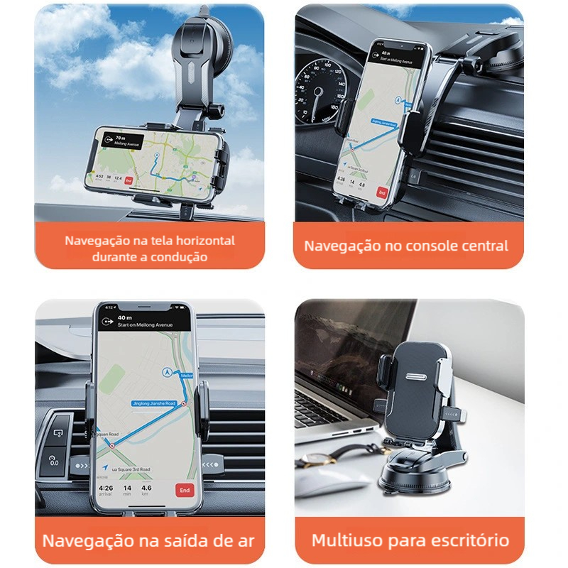 Suporte de Telefone Carro com Rotação 360° - Braço Longo, Ventosa, Antichoque