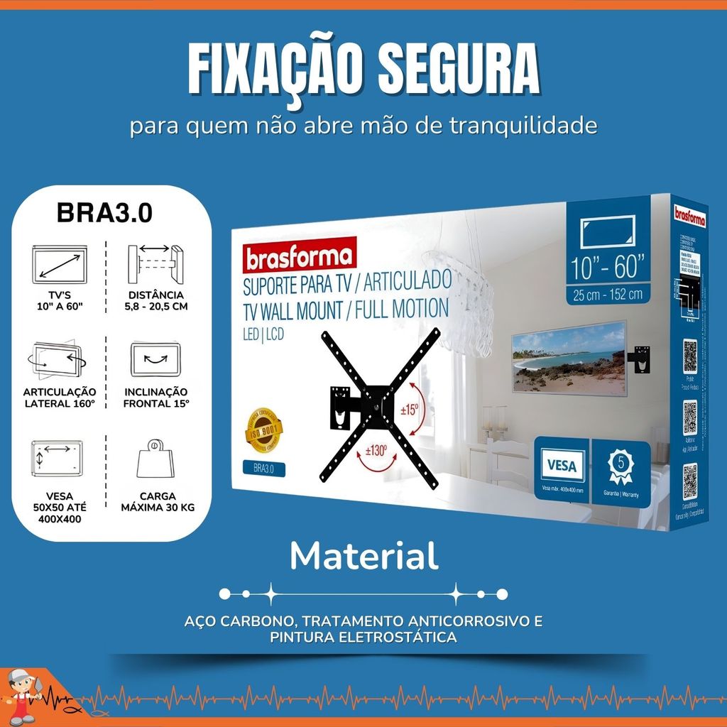 DESIGN DISCRETO E FIXAÇÃO REFORÇADA: O SUPORTE CERTO PARA SUA TV! DESCRIÇÃO O Suporte da Brasforma é o acessório ideal para você que deseja espaço e organização na sua casa. Suporta até 30kg e você pode instalar com praticidade sua TV na parede. Indicado para aparelhos de 10 a 60 polegadas. CARACTERÍSTICAS - Compatibilidade Garantida: Projetado para TVs de 10” a 60”, ele se ajusta facilmente à maioria dos modelos do mercado (LED, LCD), graças ao padrão universal VESA. Ou seja: serve para a TV que você já tem ou que pretende comprar. - Segurança e Estabilidade: Sua construção de metal reforçado oferece suporte firme e confiável, mantendo sua TV segura e sem vibrações — mesmo em paredes mais finas. - Design Discreto e Sofisticado: O modelo articulado permite 3 movimentos sendo eles inclinação, articulação e rotação agregando diversos ângulos para suas atividades e também modernidade. - Instalação Fácil e Completa: Acompanha parafusos, buchas e manual, facilitando a instalação. Mesmo quem não tem experiência consegue montar com facilidade. FICHA TÉCNICA - Tipo: Articulado - Para visão frontal, lateral e superior - Polegadas: 10" - 60" - Distância mínima da parede: 5,8 cm - Distância máxima da parede: 20,5 cm - Inclinação: 15o - Articulação: 130o - Cor: Preto - Local de Instalação: Parede - Garantia: 05 anos - Furação Vesa: 50x50, 75x75, 100x100, 200x100, 200x200, 300x200, 300x300, 400x100, 400x400mm - Pontos de Fixação: 4 pontos - Parafusos: M6x20mm, M8x25mm - Capacidade de Carga: 30kg - Material: Aço carbono, tratamento anticorrosivo e pintura eletrostática O QUE ACOMPANHA - 01 Suporte Articulado Para TV 10’’ - 60’’ Brasforma