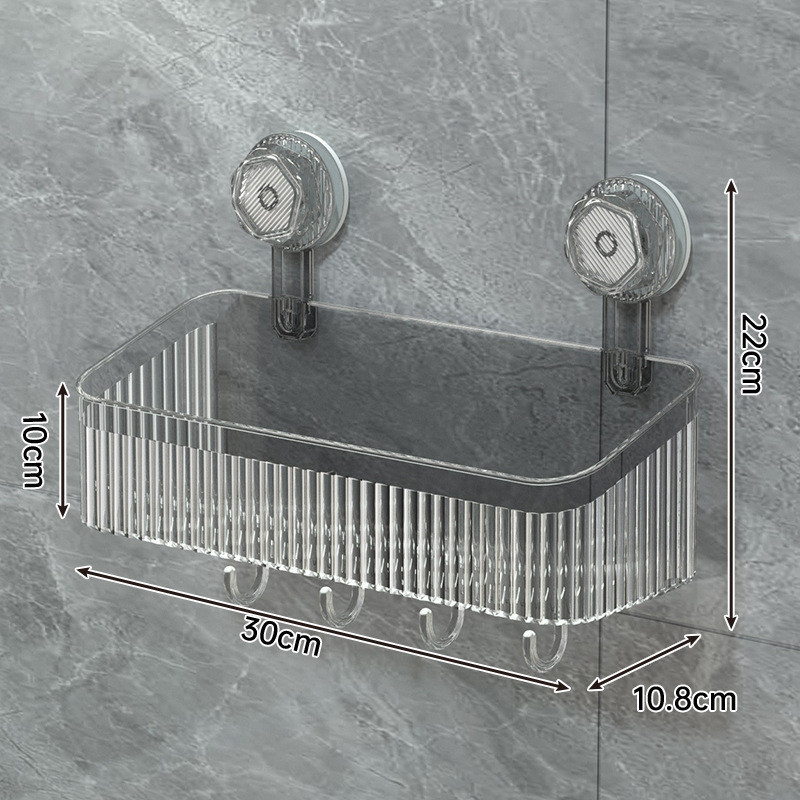 Caixa de armazenamento montada na parede com ventosa de instalação sem furos Instalação rápida/removível para lavagem/forte suporte de carga Dimensões: 29 cm * 10,7 cm * 10 cm Altura total 22cm, peso líquido 318g, material: PET Cor: branco transparente/cinza transparente/verde transparente Método de instalação: Instalação de ventosa, adsorvida na parede.A parede precisa ser lisa e limpa. (Melhores condições: vidro/azulejo)