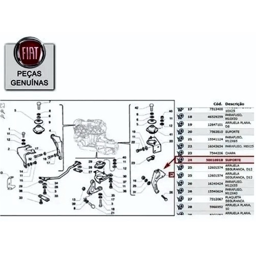 Suporte do Coxim Lado Câmbio Fiat Uno Mille Fire 1.0 Original FIAT Mopar com Nota Fiscal e Garantia 1 - Suporte Coxim Câmbio uno Fire Fiorino Palio NUMERO ORIGINAL: 50016918 PRODUTO ORIGINAL FIAT MOPAR -Aplicação: Fiorino (1985 a 2004) Fiorino Fire 1.3 Fire 8v (2004 a 2007) Fiorino Fire Ambulância 1.3 Fire 8v (2004 a 2007) Fiorino Fire Ambulância 1.3 Fire 8v (2007 a 2013) Fiorino Fire Furgão 1.3 Fire 8v (2004 a 2013) Fiorino Fire Furgão 1.3 Fire 8v (2007 a 2013) Uno (1985 a 2004) Uno Fire 1.3 Fire 8v (2004 a 2008) Uno Fire 1.3 Fire 8v (2004 a 2011) Uno Fire 1.3 Fire 8v (2004 a 2013) Uno Fire 1.3 Fire 8v (2007 a 2008) Uno Fire Furgoneta 1.3 Fire 8v (2004 a 2007) Uno Fire Furgoneta 1.3 Fire 8v (2004 a 2013) Uno Fire Furgoneta 1.3 Fire 8v (2007 a 2008) Uno Fire Furgoneta 1.3 Fire 8v (2007 a 2013) Uno Mille (1985 a 2013) Uno Way 1.3 Fire 8v (2007 a 2008) Uno Way 1.3 Fire 8v (2009 a 2011) Uno Way 1.3 Fire 8v (2009 a 2013) MARCA: FIAT MOPAR *INFORMAÇÕES IMPORTANTES* 1 - NOSSOS PRODUTOS NÃO SÃO RECOMENDADOS PARA ADAPTAÇÕES, MAS SIM PARA REPOSIÇÃO. 2 - ANALISE COM CAUTELA A APLICAÇÃO DA PEÇA E, SE NECESSÁRIO, VERIFIQUE COM SEU MECÂNICO DE CONFIANÇA UTILIZANDO AS FOTOS DO ANÚNCIO PARA TER CERTEZA DE QUE ESTA É A PEÇA QUE VOCÊ REALMENTE PRECISA. 3 - SE ASSEGURE DE ESTAR EFETUANDO A COMPRA CORRETA PARA EVITAR EVENTUAIS PROBLEMAS E GASTOS. 4 - PRODUTOS QUE NECESSITAM INSTALAÇÃO A MESMA DEVE SER FEITA POR UM PROFISSIONAL CAPACITADO. 5 - NÃO NOS RESPONSABILIZAMOS POR USO INDEVIDO OU INSTALAÇÃO INCORRETA. 6 - NÃO ACEITAMOS DEVOLUÇÃO DO PRODUTO SEM A EMBALAGEM ORIGINAL. 7 - TODOS PRODUTOS SÃO NOVOS COM 3 MESES DE GARANTIA E NOTA FISCAL. 8 - À POSTAGEM É FEITA NO MESMO DIA PARA PEDIDOS FEITO ATÉ AS 13HS. 9 - TIRE TODAS AS DUVIDAS ANTES DE CLICAR EM COMPRAR. • AGRADECEMOS A SUA PREFÊRENCIA! N-20977