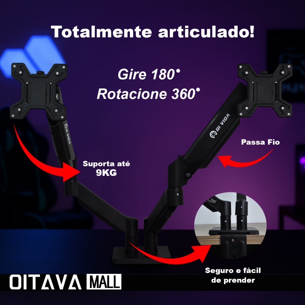 Suporte Duplo de Monitor com Braço Articulado – Mais Produtividade e Organização Transforme seu espaço de trabalho com este suporte duplo para monitores, ideal para quem precisa de praticidade, ergonomia e melhor aproveitamento da mesa. Perfeito para home office, escritórios e setups profissionais ou gamers. Com capacidade para suportar até 10kg por monitor, o sistema de braços articulados permite ajustes independentes, garantindo total liberdade para posicionar as telas conforme sua necessidade. PRINCIPAIS CARACTERÍSTICAS: - Suporte para 2 monitores de até 10kg cada - Rotação de até 180° para melhor ajuste de visualização - Altura ajustável de até 400mm - Braços articulados que permitem movimentação suave e precisa - Ajuste individual para cada monitor - Fixação por braçadeira, firme e segura na mesa - Estrutura resistente e durável VANTAGENS DO PRODUTO: - Aumenta a produtividade com duas telas - Melhora a ergonomia e reduz esforço no pescoço e costas - Libera espaço na mesa, deixando o ambiente mais organizado - Ideal para trabalho, estudos, programação, edição e jogos - Fácil de instalar e ajustar, este suporte duplo é a escolha certa para quem busca conforto, eficiência e um setup mais profissional. Aproveite agora e leve mais praticidade para o seu dia a dia.