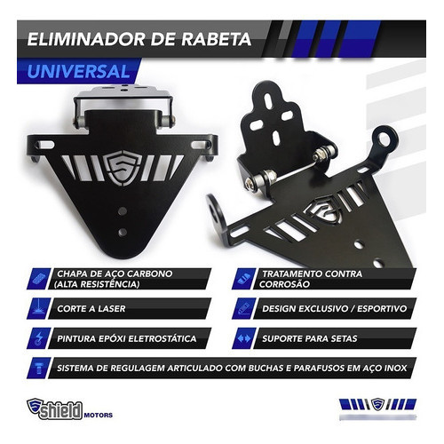 A Shield Motors tem a missão de comercializar somente produtos e soluções de excelência garantindo o melhor resultado possível aos clientes. Assim estabelecendo uma relação de confiança! ELIMINADOR DE RABETA ARTICULADO Sem abrir mão do design e qualidade o Eliminador de Rabeta ShieldMotors é para pessoas exigentes, pois é confeccionado com os melhores materiais do mercado, garantindo durabilidade e resistência, proporciona um visual esportivo e arrojado para sua moto e conta com a possibilidade de regulagem na posição desejada. ESPECIFICAÇÕES: Contém: 01 kit (01 eliminador de rabeta + 01 kit instalação com parafusos e arruelas) Material: aço carbono - buchas em alumínio e parafusos/arruelas em aço inox Cor: preto Características: - Produzido em Aço Carbono, cortado a laser e dobrado em equipamentos de última geração; - Único no mercado com chapa de aço carbono 1/8" - Não dobra e não amassa em altas velocidades; - Pintura epóxi, micro-texturizada com tratamento anti-corrosão; - Modelo articulado, com buchas em alumínio e parafusos/arruelas em aço inox; - Suporte lateral para setas; - Fácil instalação; - Furação universal, porém para algumas motos pode ser necessário realizar furações extras. ATENÇÃO: recomendamos que a instalação seja realizada apenas por profissionais qualificados, sendo que não nos responsabilizamos por mau uso e/ou instalações inadequadas. Reapertar os parafusos após 1.000Km rodados, eliminando quaisquer folgas. Fotos meramente ilustrativas. As tonalidades das cores podem sofrer pequenas alterações devido à iluminação, configuração de tela ou lotes diferentes. Tenha tranquilidade de comprar com quem está disposto a oferecer o melhor atendimento. Caso precise de ajuda após a compra, conte com nossa equipe de pós-venda. Estamos sempre à disposição para tirar qualquer dúvida.