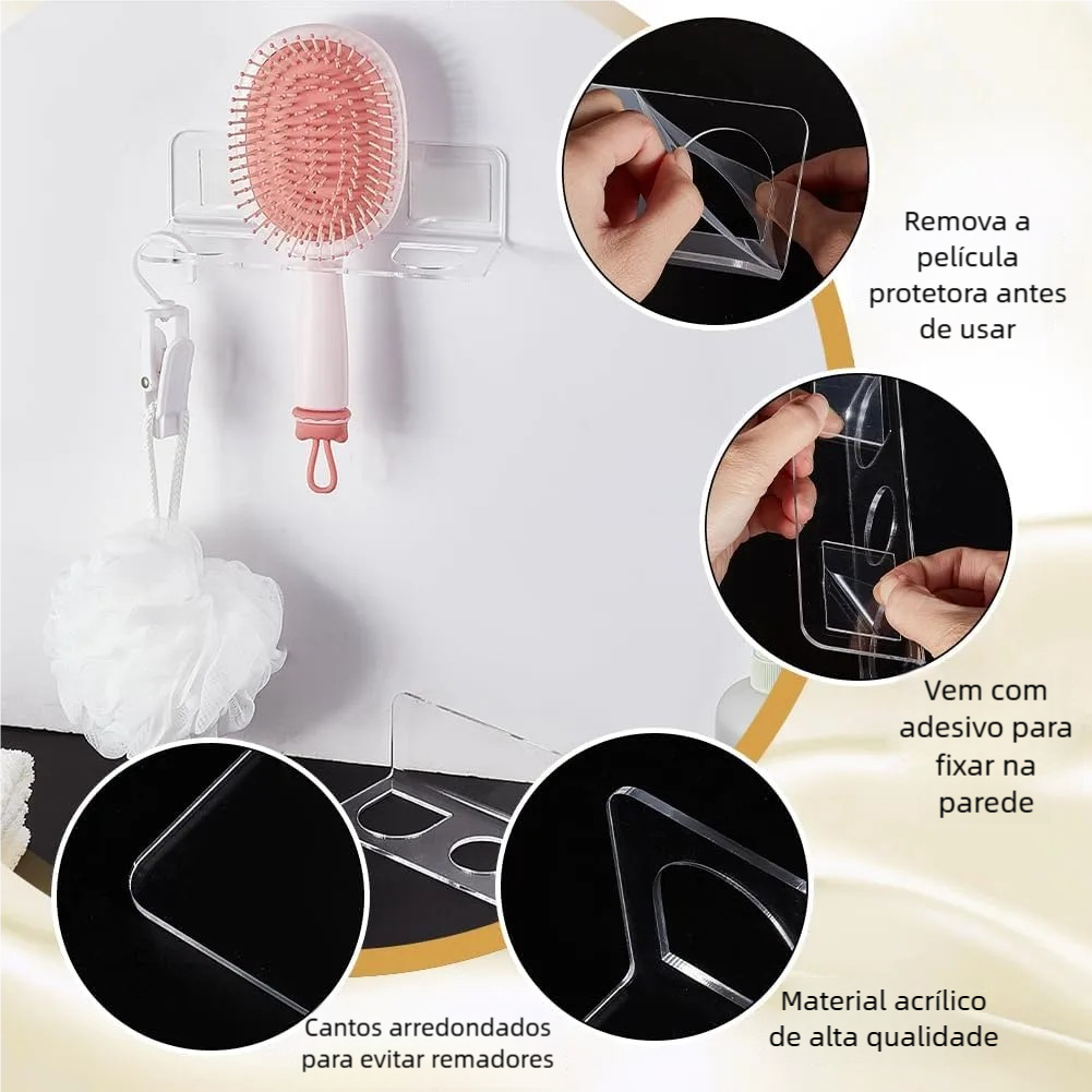 Suporte Escova de Cabelo Acrílico Cristal – Fácil de Limpar, Sem Sujeira Acumulada! Não gasta tempo com limpezas complicadas! O acrílico liso do suporte não acumula poeira ou resíduos de produtos de cabelo. Basta passar um pano úmido e ele está como novo. Ideal para uso diário – mantenha o suporte limpo e brilhante sem esforço. Durável, transparente e prático – tudo que você precisa para uma rotina tranquila!