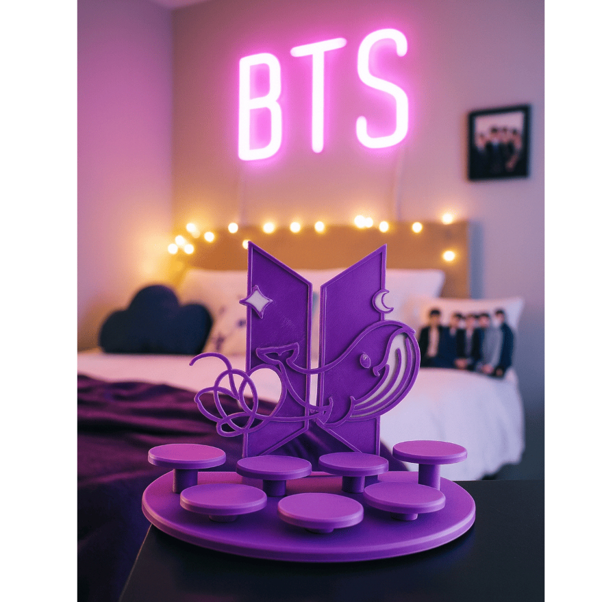 💜 Inspire-se no universo do BTS! 💜 Exiba sua coleção TinyTAN com sofisticação e emoção com este suporte exclusivo inspirado no álbum Love Yourself do BTS — um tributo ao amor-próprio e à beleza de ser fã. Transforme os bonecos do McD’s em uma peça de destaque com um display elegante, moderno e cheio de significado, criado especialmente para quem vive e sente o BTS em cada detalhe. ✨ Diferenciais que encantam: - Design inspirado no logo oficial e na estética do álbum Love Yourself, realçando a identidade da sua coleção. - Espaço perfeito para os 7 membros, com área central de destaque. - Produzido em Plástico Premium, material resistente, sustentável e de alta qualidade. - Acabamento impecável, que transforma o suporte em parte da decoração — e do seu coração ARMY. 💜 Ideal para colecionadores apaixonados ou para quem quer dar um toque BTS ao seu ambiente, este suporte é o detalhe que leva sua coleção TinyTAN ao próximo nível.