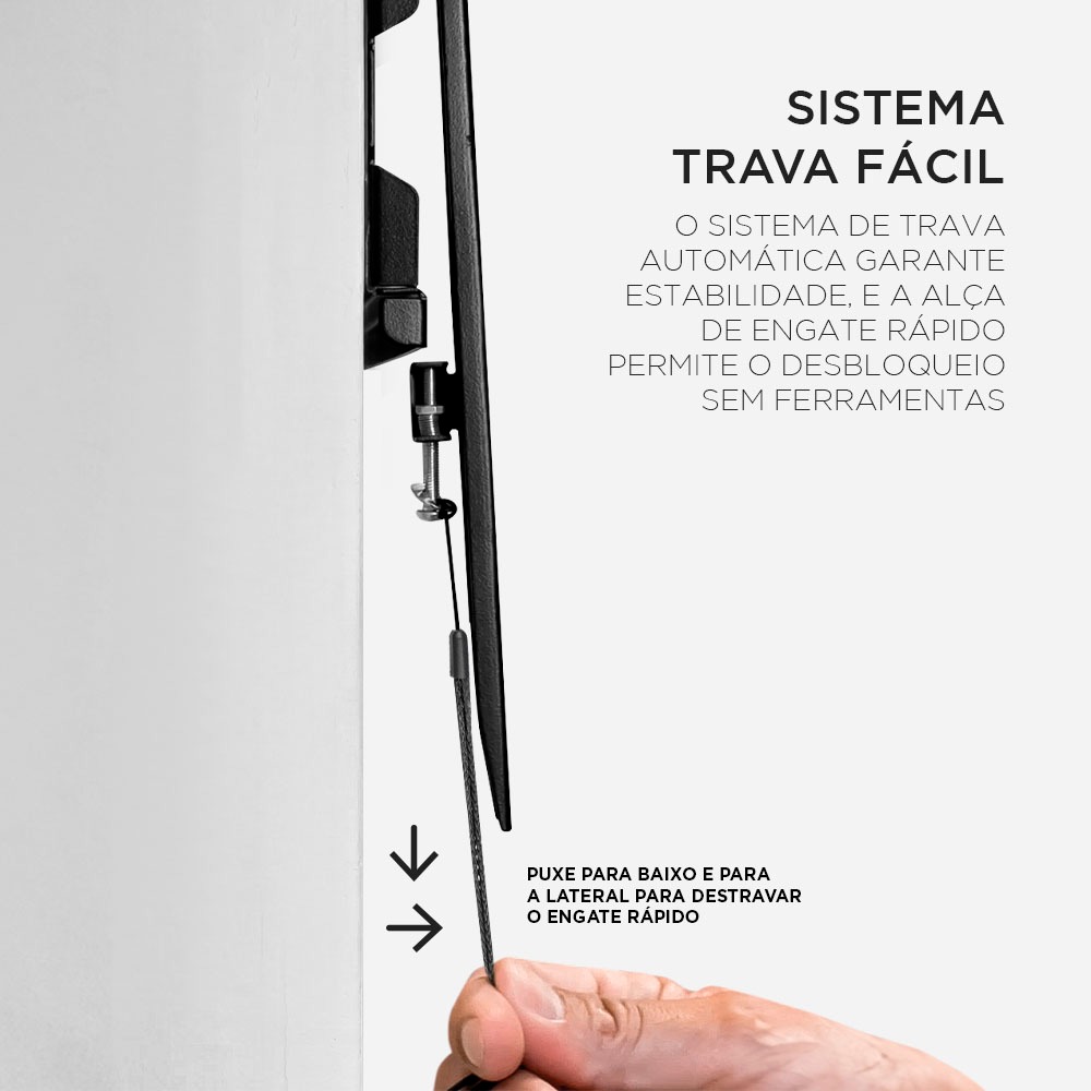 Qualidade, segurança e inovação que você só encontra na ELG, líder da categoria. O suporte de parede inclinável A03V4S é a solução ideal para TVs de 32" a 70", com peso máximo de 45 kg e compatibilidade com padrões VESA de 75x75 a 400x400 mm (HxV). Fabricado em aço carbono com tratamento anticorrosão e pintura epóxi de alta resistência, ele garante segurança, durabilidade e um acabamento impecável para integrar ambientes residenciais e corporativos. Com um design funcional e perfil slim, o A03V4S mantém a TV a apenas 7 cm da parede, facilitando o acesso às conexões. O sistema de trava de segurança automática "Trava Fácil" assegura total estabilidade, enquanto a alça de engate rápido permite o desbloqueio sem a necessidade de ferramentas. Este suporte para TV também conta com inclinação ajustável de até -10°, ideal para reduzir reflexos e otimizar o ângulo de visão. Para maior comodidade, o produto já vem montado de fábrica e sua instalação é realizada em apenas três passos, auxiliada pelo nível bolha que acompanha o produto. Na embalagem você recebe 1 Suporte Inclinável, 1 kit de acessórios completo para instalação na parede e no televisor e 1 manual de instruções, pronto para instalação imediata. Características Técnicas Tipo: Inclinável Polegadas compatíveis: 32" a 70" Carga máxima: 45kg Distância da parede: 7cm Inclinação vertical (Tilt): 0° a -10° Padrão VESA: 75x75 a 400x400mm (HxV) Material: Aço carbono Pintura: Epóxi Eletrostática Tratamento superficial: Anticorrosão Compatibilidade: TVs LED, LCD e Plasma Cor: Preto Extras: Sistema Trava Fácil com alça de engate rápido, perfil slim, nível bolha integrado. IMPORTANTE :: As imagens dos produtos são meramente ilustrativas e podem apresentar pequenas variações de cor ou acabamento, conforme iluminação, resolução do monitor ou percepção visual. :: Objetos de decoração e itens adicionais exibidos nas fotos não acompanham o produto. :: Todas as informações técnicas e características dos produtos são de responsabilidade da marca ELG, podendo sofrer alterações sem aviso prévio. :: Os pedidos são sempre enviados de forma completa. Caso haja produtos com prazos de postagem diferentes, será considerado o maior prazo para envio do pedido. :: Valores e condições podem ser alterados sem aviso prévio e são válidos exclusivamente para compras realizadas neste site. :: A garantia ELG é limitada ao produto e não cobre danos ocasionados por mau uso, instalação incorreta ou manuseio inadequado. SOBRE A ELG: A ELG é uma empresa brasileira que preza pela alta qualidade. Nossa política é aplicada em toda linha de produtos e garante que os consumidores possam adquirir itens que foram amplamente testados.
