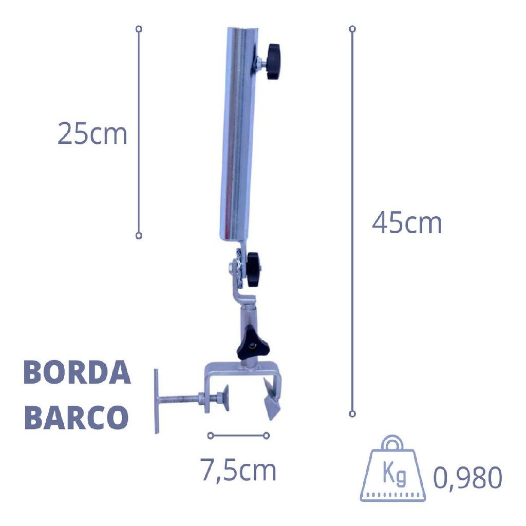 Suporte para guarda sol em ferro galvanizado, leve e compacto, ideal para barcos. Possui trava de segurança para fixação firme, com dimensões de 11x7x40 cm e peso aproximado de 0,98 kg. Produto resistente e regulável, perfeito para garantir estabilidade e conforto durante o uso.
