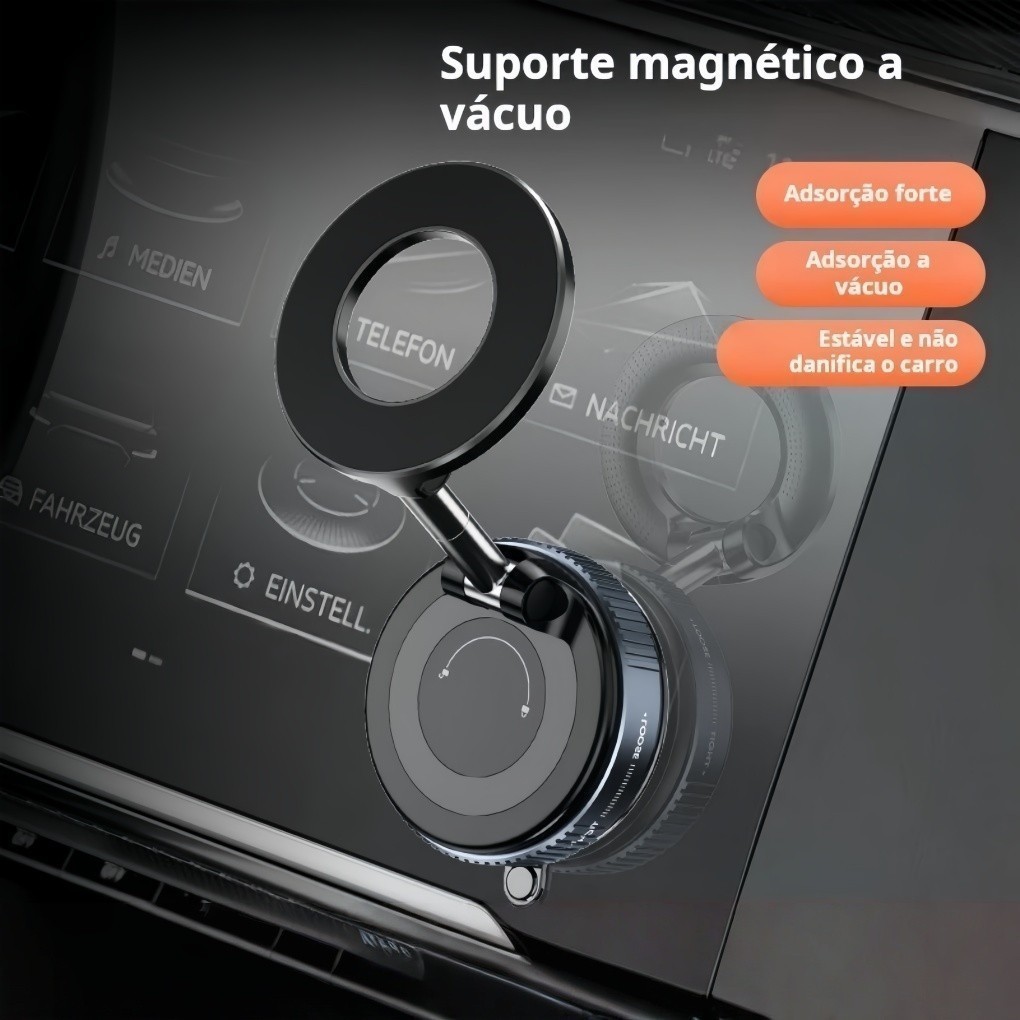 O Suporte Magnético Dobrável 360° com Ventosa a Vácuo é a solução ideal para quem busca praticidade, estabilidade e design sofisticado. Desenvolvido com tecnologia de adsorção magnética a vácuo, ele oferece fixação extremamente segura em qualquer superfície lisa, seja no carro, na mesa de trabalho ou em casa. Seu design dobrável e ajustável permite total liberdade de uso, ocupando pouco espaço quando fechado e proporcionando ângulos ideais para visualização quando aberto. Principais Características Rotação 360° e ajuste multiângulo: Permite posicionar o celular em qualquer direção, ideal para navegação, videochamadas ou visualização de vídeos. Fixação magnética potente: Ímãs de alta densidade garantem firmeza e segurança, mantendo o celular estável mesmo em estradas irregulares ou durante movimentos bruscos. Ventosa com adsorção a vácuo: Oferece aderência forte e duradoura em painéis de carro, vidros, mesas ou superfícies metálicas, sem necessidade de cola ou parafusos. Design retrátil e compacto: Pode ser facilmente dobrado e guardado, ideal para quem busca praticidade e portabilidade. Construção robusta: Fabricado em liga metálica de alta qualidade, resistente ao desgaste e com acabamento moderno e elegante. Medidas do Produto Altura (fechado): 43 mm / 1,69 pol Altura (aberto): 124 mm / 4,88 pol Diâmetro da base: 59 mm / 2,32 pol Especificações Técnicas Material: Liga metálica + alumínio Rotação: 360° Tipo de fixação: Magnética com ventosa a vácuo Estrutura: Retrátil e dobrável Cor: Preto e branco Tamanho: 59 x 43 mm (fechado) / 59 x 124 mm (aberto) Indicações de Uso Painel, para-brisa ou vidro lateral do carro Mesa de escritório ou criado-mudo Cozinha, para assistir vídeos ou seguir receitas Qualquer superfície lisa onde seja necessário fixar o celular com estabilidade