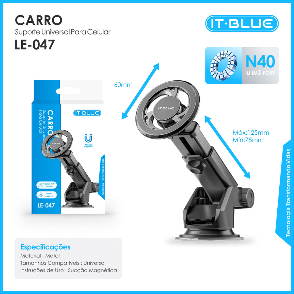 Suporte Magnético Veicular para Celular Universal com Ventosa Ajuste de Ângulo para Carro Imã N40 LE-047