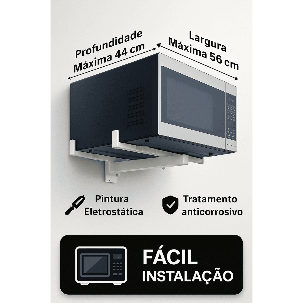 Suporte de Parede Ajustável para Micro-ondas e Forno Elétrico Benefícios e vantagens: Libere espaço imediato na bancada e organize sua cozinha Evite quedas e acidentes com seu micro-ondas ou forno elétrico Tenha acesso fácil e ergonômico ao equipamento Reduza o estresse visual e ganhe sensação de controle do ambiente Estrutura reforçada em aço carbono com pintura epóxi para durabilidade máxima Ajustável para diferentes modelos de micro-ondas e forno elétrico Utilidades e aplicações: Suporte para micro-ondas, forno elétrico, bebedouro ou eletrodomésticos Ideal para cozinhas pequenas, apartamentos, kitnets e áreas gourmet Organização de despensas e otimização do espaço vertical Facilita a limpeza e manutenção do ambiente Uso em escritórios, lavanderias ou cozinhas industriais leves Modo de uso e instalação: Fixe o suporte na parede utilizando buchas e parafusos incluídos Ajuste a largura de 44 a 56 cm conforme o tamanho do aparelho Certifique-se de instalar em parede resistente para máxima segurança Coloque o micro-ondas ou forno elétrico sobre o suporte ajustado Pés antiderrapantes garantem estabilidade e proteção Características técnicas: Material: Aço carbono com pintura epóxi anticorrosiva Capacidade de carga: até 40kg Ajuste de largura: 44 a 56 cm Sistema de fixação com buchas e parafusos para parede de alvenaria Pés antiderrapantes para estabilidade adicional Compatível com micro-ondas e forno elétrico de diferentes modelos Este suporte não é apenas um suporte. Ele oferece segurança, controle e organização em sua cozinha. Com ele, você elimina a bagunça, protege seus eletrodomésticos e transforma sua rotina, trazendo praticidade, conforto e tranquilidade.