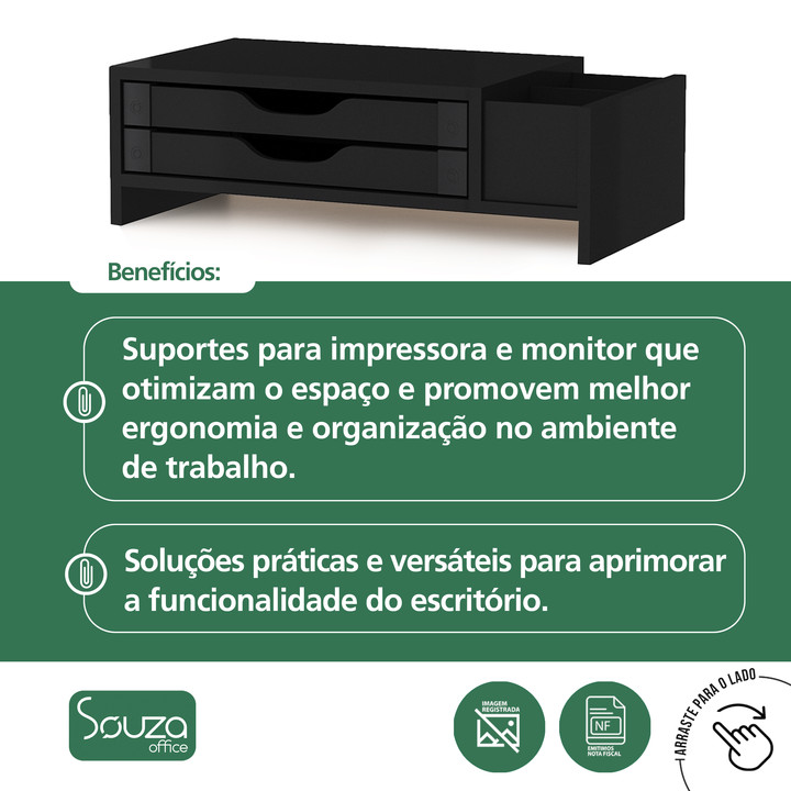Suporte de Monitor com 2 Gavetas e 3 Nichos Souza – MDF Preto Seu home office nunca mais será o mesmo. O Suporte de Monitor Souza é o equilíbrio perfeito entre organização, elegância e praticidade. Produzido em MDF de alta qualidade com acabamento na cor Preto, ele eleva o nível do seu ambiente de trabalho e melhora sua postura durante o uso do computador. Ideal para quem busca um escritório mais limpo, ergonômico e com visual moderno. DADOS TÉCNICOS: Material: MDF Preto (acabamento liso e resistente) 2 gavetas + 3 nichos para organizar objetos, canetas, cadernos, celular e acessórios Medida do suporte: 49 x 25,5 x 15 cm Medida das gavetas: 24 cm x 34 cm Medida dos nichos: 21,5 cm x 33 cm Destaques que fazem diferença: Ergonomia inteligente: eleva o monitor, aliviando dores no pescoço e ombros Organização total: gavetas e nichos ideais para manter tudo ao alcance Design clean: combina com qualquer ambiente – do escritório moderno à escrivaninha de casa Construção robusta: MDF de alta densidade, garantindo estabilidade e durabilidade Entrega rápida e embalagem segura: Seu produto é embalado com cuidado e protegido contra danos no transporte. A Souza Office garante que seu pedido chegue em perfeito estado e dentro do prazo. Nota Fiscal Eletrônica (NF-e) emitida em todas as compras — segurança e credibilidade do início ao fim da sua experiência!