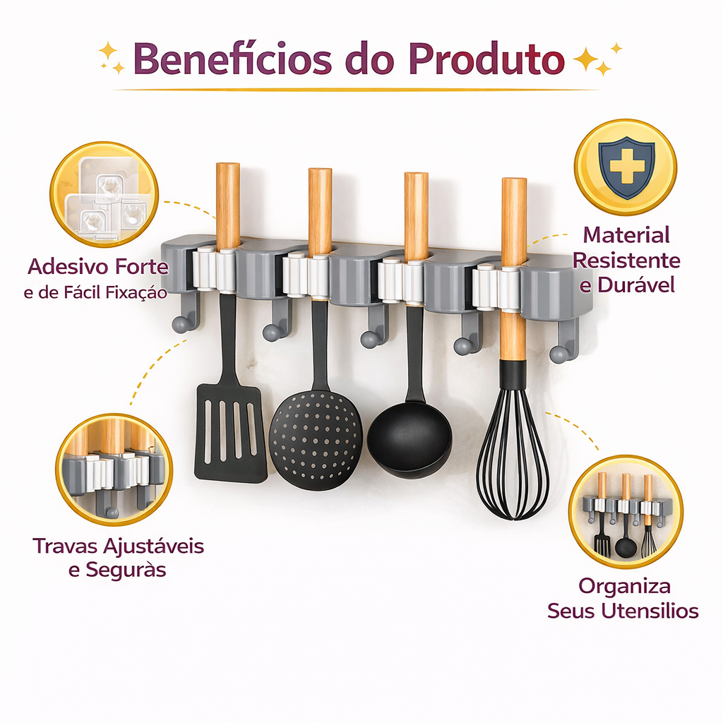Suporte Multiuso Adesivo para Utensílios e Vassoura Organizador de Cozinha e Lavanderia Sem Furo Porta Talheres