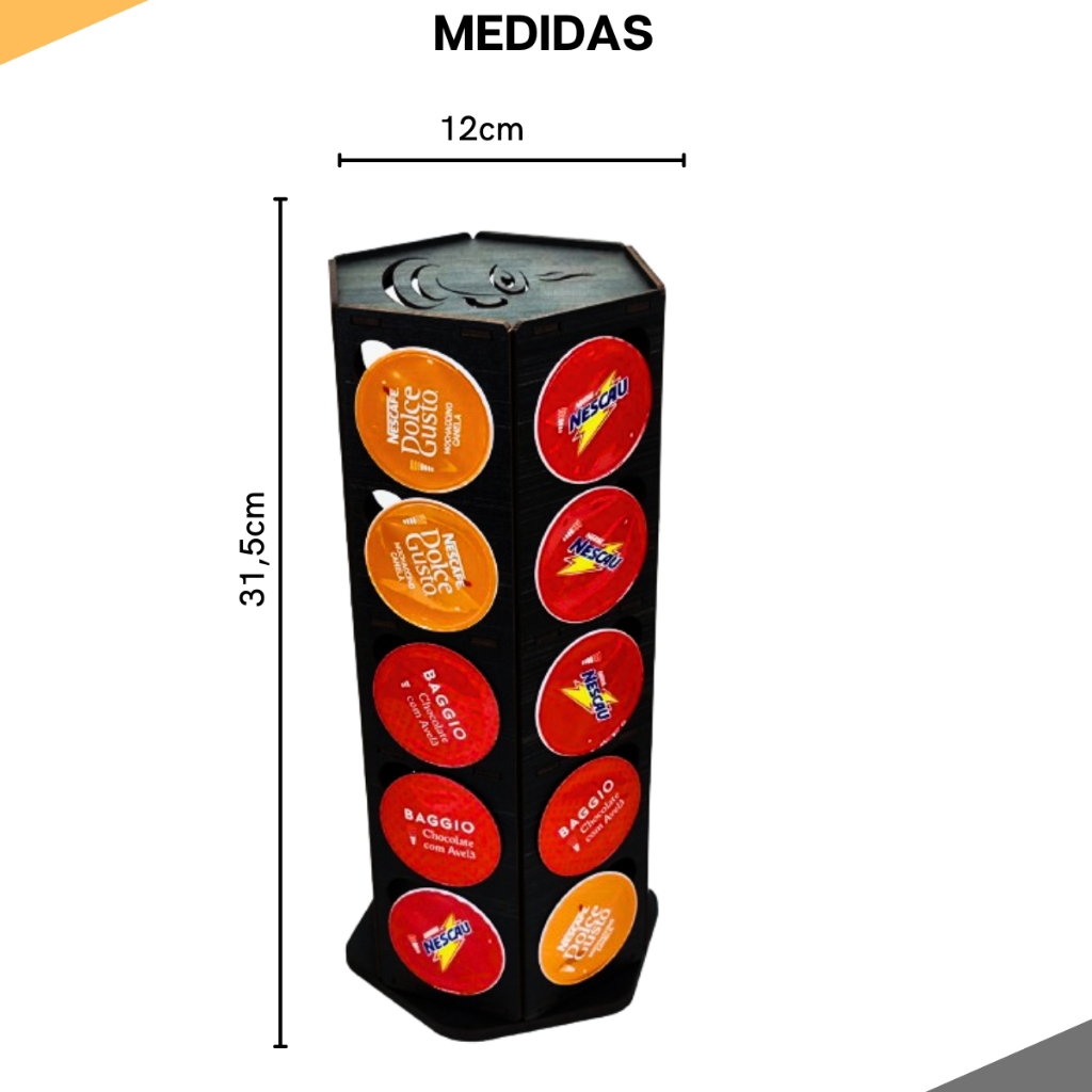O Suporte Torre Giratório P/30 Cápsulas Dolce Gusto da marca MAGICBOX PRESENTES é ideal para organizar suas cápsulas de café de maneira prática e elegante. Com capacidade para 30 cápsulas compatíveis com a marca Dolce Gusto, permite que você tenha sempre suas opções favoritas ao alcance das mãos. Com altura de 31,5 cm e comprimento e largura de 13 cm, este suporte é compacto e se encaixa facilmente em qualquer espaço da sua cozinha. Feito em MDF de alta qualidade, o suporte é resistente e durável. Sua característica giratória facilita o acesso rápido às cápsulas. Produzido em MDF, para cápsulas utilizadas em cafeteiras Dolce Gusto Design especial Base com EVA para dar estabilidade ao porta cápsula Além de organizar sua cozinha, copa ou cantinho do café, também decora e enfeita o ambiente. Contém: 01 Porta Cápsulas Giratório para 30 cápsulas Dolce Gusto Medidas: Altura: 31,5cm largura : 12 cm comprimento:12 cm Peso: 0,400g Todo produto feito em MDF é sensível a umidade, por isso não deixe em contato direto com líquidos para não danificá-lo. Pode ser limpo com pano levemente umedecido com água.