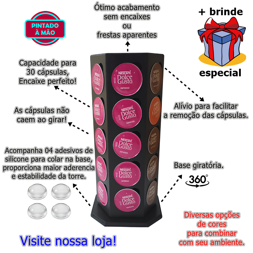 Temos diversas cores para você escolher: - PRETO - VERMELHO - BRANCO - VERNIZ - ROSA CLARO (ROSA BEBÊ) - ROSA ESCURO (ROSA CHICLETE) - CINZA - VERDE - AMARELO - LARANJA - AZUL - CRU (SEM PINTURA) PORTA CÁPSULAS GIRATÓRIO PARA CÁPSULAS DE CAFÉ DOLCE GUSTO Produzido em MDF, para cápsulas utilizadas em cafeteiras DOLCE GUSTO Design especial Fabricada em MDF, pintura na cor escolhida. Além de organizar a sua cozinha, copa ou cantinho do café, também vai decorar e enfeitar o ambiente. Lindo e prático. Contém: - 01 Porta Cápsulas Giratório para 30 cápsulas OU - 02 Porta Cápsulas Giratório para 30 cápsulas cada Atenção: Este produto passa por processo artesanal de pintura. As cores apresentadas podem sofrer variações de tonalidade de acordo com o lote da tinta e da peça em MDF utilizada no processo de pintura do produto. Medidas: Altura:34cm Comprimento: 16cm Largura: 16cm Peso:0,4Kg O Organizador P/30 Cápsulas Café Dolce Gusto Giratório da marca FESHOP é perfeito para os amantes de café que desejam manter suas cápsulas organizadas e de fácil acesso. Com capacidade para até 30 cápsulas compatíveis com a Dolce Gusto, este organizador é prático e funcional. Com altura de 34 cm e comprimento e largura de 16 cm, ele possui um design compacto que se encaixa perfeitamente em qualquer espaço da sua cozinha. Feito em MDF de alta qualidade, o modelo Dolce Gusto é elegante e sofisticado. Além disso, o organizador é giratório, o que facilita na hora de escolher a sua cápsula preferida. Não perca tempo procurando suas cápsulas, tenha tudo organizado e ao alcance das mãos com o Organizador P/30 Cápsulas Café Dolce Gusto Giratório. Há diversas cores disponíveis para sua escolha, há tbm a opção sem pintura para que vc possa realizar sua arte no seu cantinho do café. Acompanha pés de silicone (gotas de silicone) para colar na base e dar mais estabilidade e aderência na superfície.