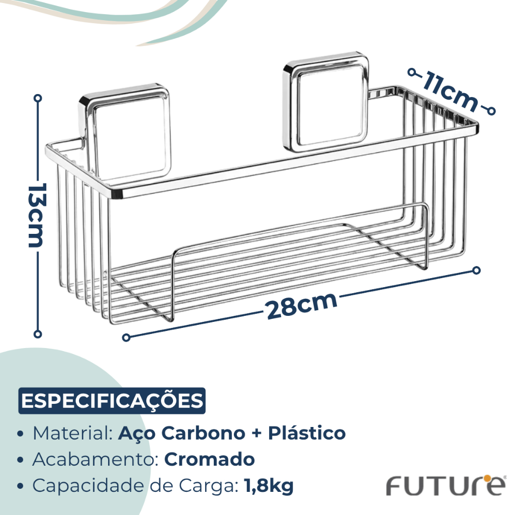 SOBRE O PRODUTO Acessório para banheiro com fixação através de adesivo. O Suporte de Shampoo com fixação por adesivo pode ser utilizado dentro do box com shampoos e condicionadores mas também próximo à pia do banheiro, com seus cremes hidratantes e demais itens de beleza. Possui instalação prática, rápida e sem sujeira, graças ao sistema de adesivo 3M. Pode ser fixado com facilidade. Posicione no melhor local no banheiro ou no lavabo. O aço Piatina (em formato achatado) dá o toque especial que o banheiro e o lavabo merecem. Além do tradicional tratamento superficial da Future - onde são aplicadas até 4 camadas de metal - os produtos são revestidos com uma camada extra do protetivo especial Rust Free, garantindo cores vivas e brilhantes, além de maior resistência contra ferrugem. Itens inclusos: 1 Suporte Shampoo com Adesivo 3M RECOMENDAÇÕES Superfícies recomendadas: Cerâmica, porcelanato, mármore, granito, metal liso, vidro, concreto liso, madeira. Não recomendado (pode ser utilizado com parafuso): Paredes pintadas ou com papel de parede (pode danificar a superfície caso necessária a remoção do adesivo). Superfícies irregulares, ásperas, brutas ou com textura grossa. MEDIDAS - Profundidade: 11cm - Lagura: 28cm - Altura: 13cm - Peso: 0,388kg ESPECIFICAÇÕES - Máteria Prima: Aço Carbono / Plástico - Cor/Acabamento: Cromado - Capacidade: 1,8kg