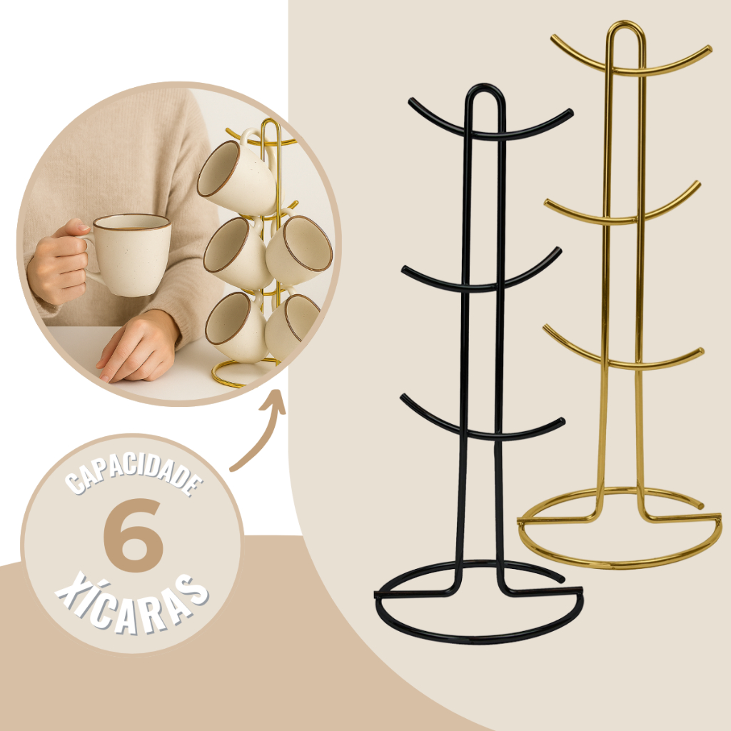 SOBRE O PRODUTO Utilize o Suporte para deixar a hora do cafézinho ainda mais elegante. As xícaras e os pires ficam organizados, de fácil acesso e decoram a cozinha. Na cor preto fosco, acabamento liso e fosco. A pintura a pó aplicada na peça garante uma excelente cobertura protetiva contra corrosão e alta resistência ao impacto. Na cor Dourada, além do tradicional tratamento superficial da Future - onde são aplicadas até 4 camadas de metal - os produtos são revestidos com uma camada extra do protetivo especial Rust Free, garantindo cores vivas e brilhantes, além de maior resistência contra ferrugem. Dicas de Uso: - Para limpeza periódica recomenda-se o uso de um pano macio, água e sabão neutro. - Nunca utilize materiais abrasivos, lã de aço, esponjas ásperas, solventes ou produtos químicos corrosivos (cloro, água sanitária). ESPECIFICAÇÕES TÉCNICAS Matéria-prima: Aço Carbono Capacidade: 6 canecas / xícaras Medidas: Profundidade: 15,2cm Largura: 15,2cm Altura: 38cm Peso: 0,390kg