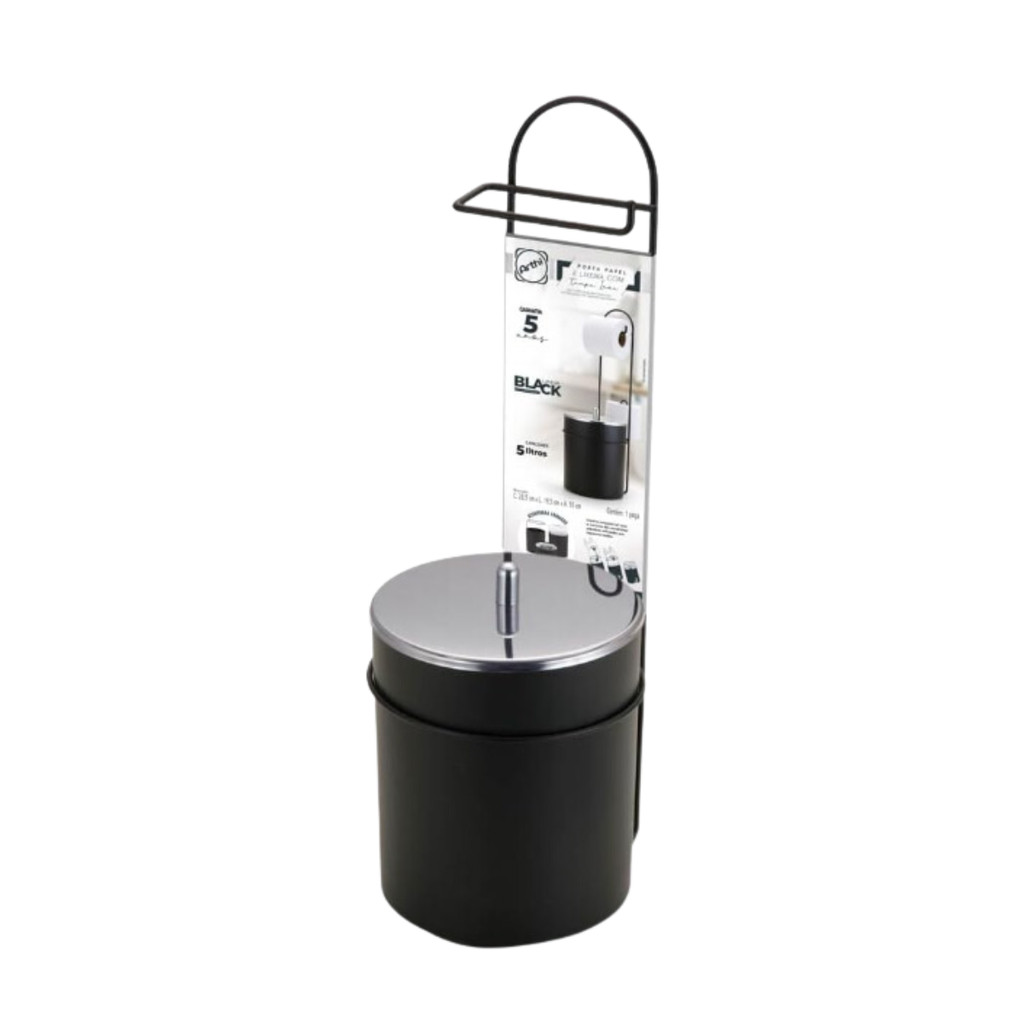 Suporte Papeleira Porta Papel Higiênico De Chão E Lixeira Preto 5 Litros Arthi