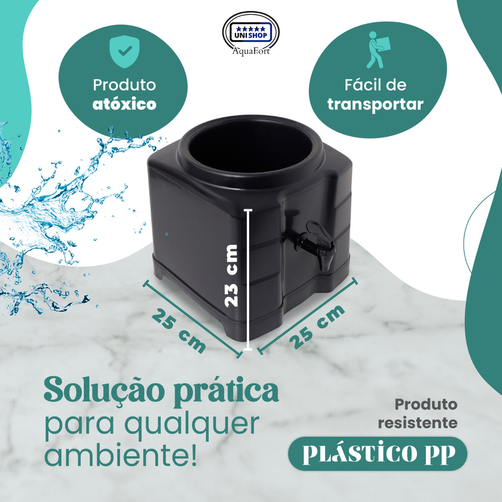 💧 Suporte Galão Roma – Praticidade e higiene para seu dia a dia! Tenha mais conforto e organização no uso de galões de água com o Suporte Galão Roma! Fabricado em plástico PP (polipropileno), um material resistente, leve e durável, ele é ideal para acomodar galões de 5L, 10L e 20L de forma estável e segura. Conta com cuba plástica fixa, que evita respingos e mantém o ambiente sempre limpo. 🟢 Características do produto: Compatível com galões de 5, 10 e 20 litros Estrutura em plástico PP, resistente e atóxico Disponível nas cores: Branco e Preto Design compacto, moderno e funcional ✅ Benefícios: Mantém o local limpo, evitando respingos e escorrimentos Produto leve, fácil de transportar e posicionar Não precisa de instalação elétrica ou montagem complicada Ideal para uso doméstico, escritórios, comércios e muito mais Ótimo custo-benefício para quem deseja praticidade no dia a dia 📦 Informações adicionais: Dimensões aproximadas: 24 cm (altura) × 24 cm (largura) × 23 cm (profundidade) Produto pronto para uso, basta posicionar o galão e aproveitar 💡 Dica: Posicione o suporte em uma bancada firme e nivelada para melhor desempenho. Ideal para quem busca uma solução prática, higiênica e econômica no consumo de água com galão.