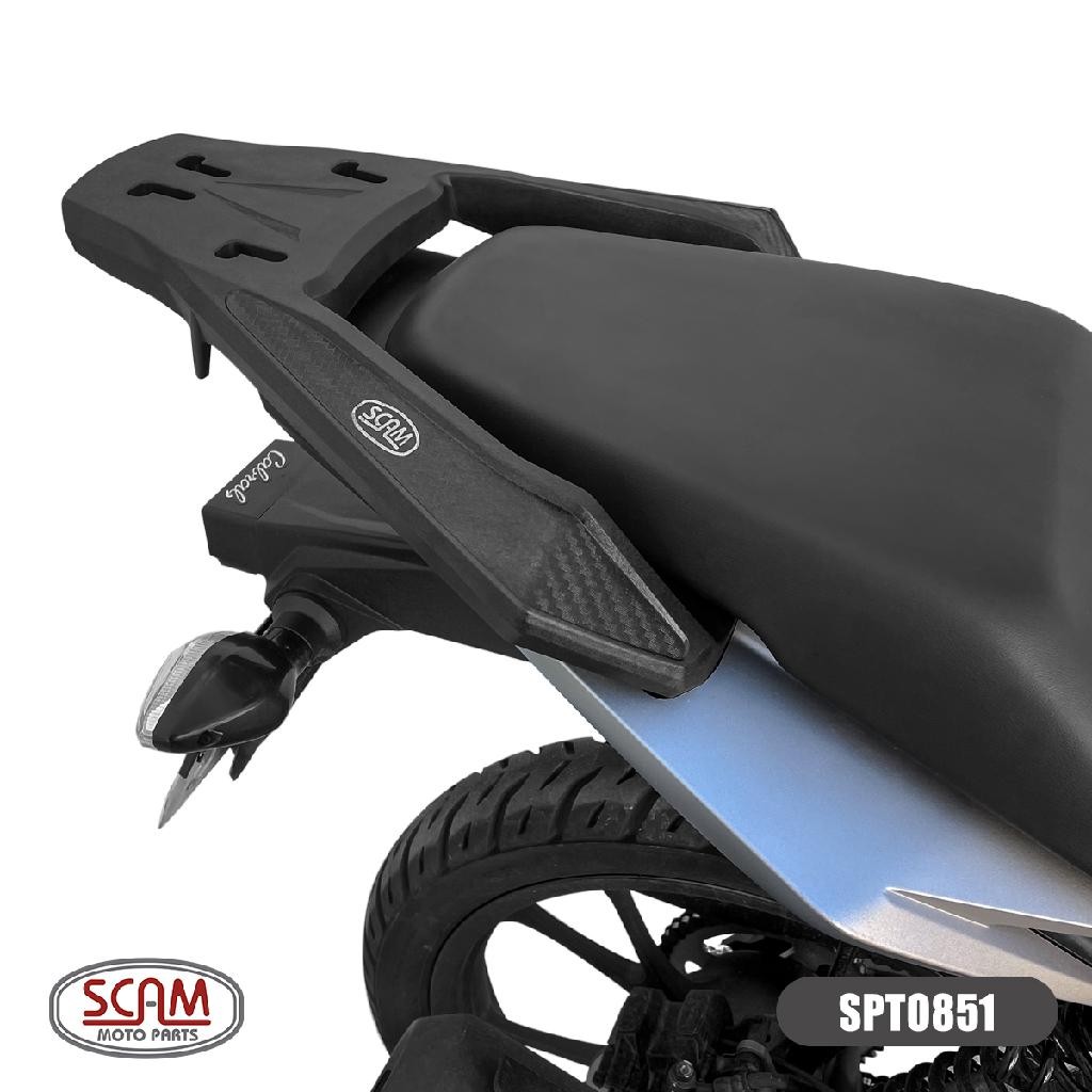 Suporte para baú superior SPTO851 Compatibilidade - Honda CG 160 FAN / START / TITAN 2025+ (NÃO COMPATIVEL COM CG 160 CARGO) Linha FIBER FORCE de suportes para baú superior, desenvolvimento exclusivo SCAM compatível com baús das principais marcas do mercado. Fabricados em POLÍMERO DE ENGENHARIA REFORÇADO COM FIBRA os suportes da linha FIBER FORCE são robustos, posicionam o baú com firmeza e respeitam o espaço do passageiro, apresentam design exclusivo e acabamento em TEXTURA DE FIBRA DE CARBONO que incrementa o visual da motocicleta. Os produtos SCAM contam com matéria-prima certificada, normalizada e um rígido controle de qualidade. Tudo isso, aliados à tecnologia na hora da fabricação, garantem durabilidade. Para você e sua motocicleta viajarem com toda segurança e confiabilidade que os produtos SCAM oferecem. Inclui: Suporte baú superior + itens de fixação. Fixação: Utiliza fixação da alça do garupa, substituindo a alça. Especificação do Material: Desenvolvido em POLÍMERO DE ENGENHARIA REFORÇADO COM FIBRA, certificada que garante alta resistência e design exclusivo. Cor: Preto fosco.