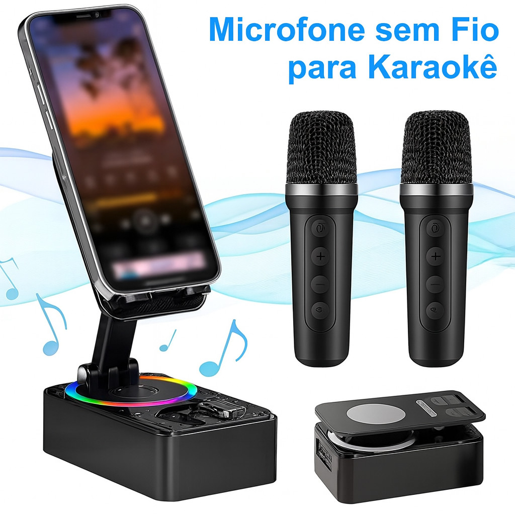 Suporte para Celular com Caixa de Som Bluetooth e 2 Microfones Sem Fio LED Recarregável Tipo C