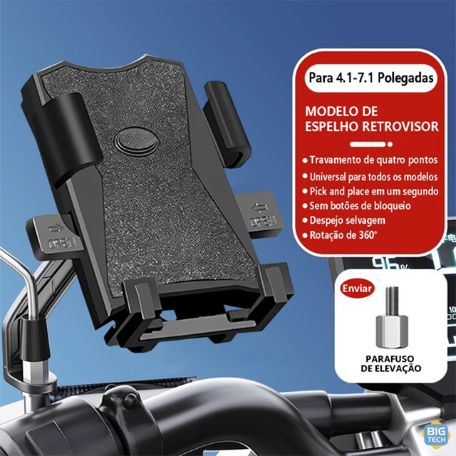 Suporte Para Celular GPS Moto Em Metal Ajustável Leve e Resistente Fixação Bem-vindo à loja 💎 BIG Tech 💎 Loja local brasileira (envio em 24 horas)🚀🚀🚀 Pedidos feitos de segunda a sexta-feira até às 12h serão enviados no mesmo dia. Pedidos feitos no final de semana serão enviados na segunda-feira. 🚀 DESTAQUES PRINCIPAIS ✅ Design Anti-Vibração 🔰 Braços Ajustáveis com Proteção: Laterais acolchoadas em TPU, compatível com celulares de 65-95mm 🌉 Base Universal: Instalação rápida em espelho retrovisor ✅ Tecnologia Profissional 🌀 Rotação 360°: Transição livre entre modo retrato/paisagem 🛡️ Proteção Contra Impactos: Material metal+ABS reforçado, testado em estradas de pedra e lombadas 🔐 Sistema de Trava: Botão de liberação com 1 clique ✅ Funcionalidades Inteligentes ✋ Operação com Uma Mão: Abra o suporte ao pressionar Botão do meio 📲 Compatibilidade Total: Adequado para smartphones de 4.1-7.1 polegadas 🌬️ Ventilação Integrada: Estrutura vazada evita superaquecimento do celular ----------------------- ⚙️ ESPECIFICAÇÕES TÉCNICAS Dimensões:11×6.6cm Material:metal + ABS reforçado Peso:94g Rotação:360° livre Largura:Ajustável 65mm → 95mm ⚠️ DICAS IMPORTANTES 🚗 Instalação Segura ▸ Aperte o parafuso da base até sentir resistência. 📱 Ajuste do Celular ▸ Puxe as abas laterais até ouvir "click". ▸ Teste a estabilidade balançando suavemente antes de sair. ⚠️ Cuidados em Viagens ▸ Evite choques diretos com galhos durante o trajeto. ----------------------- ❓ PERGUNTAS FREQUENTES P1: Funciona com capinhas grossas? ✅ R: Sim! Os braços ajustáveis suportam até 10mm de espessura. P2: Como instalar no espelho retrovisor? ✅ R: Gire a base universal 90° e aperte o grampo inferior. P3: A vibração da moto faz o celular cair? ⚠️ R: Não! Testado em estradas de terra Amortecedores internos Taxa de falha < 0.1% em velocidades < 120km/h P4: Dá para carregar o celular durante o uso? ✅ R: Sim! Conecte o cabo USB na entrada inferior(É necessário um carregador portátil) 🎯 POR QUE ESCOLHER ESTE SUPORTE? ✔️ Comprovado em Condições Extremas: chuva, terrenos acidentados #SuporteMotoProfissional