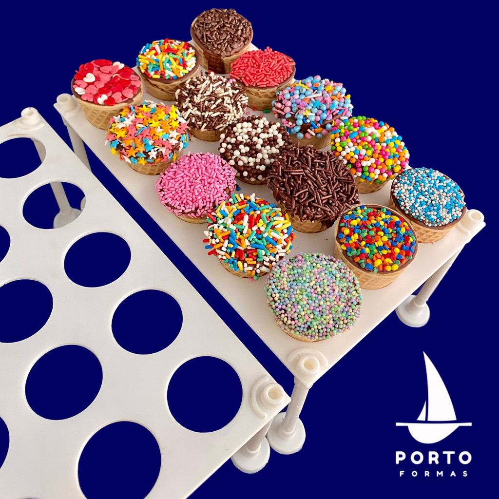 SUPORTE PARA CONE TRUFADA - 15 cavidades. Dimensões: 260 x 161 x 131 (mm) O suporte para cones são práticos e fáceis de empilhar, aproveitando melhor o espaço de produção dos cones. ATENÇÃO: - Quantidade no título do anúncio. - Não personalizamos, cores e temas apenas como está na foto. - CONFIRA O PRAZO DE ENVIO NO ATO DA COMPRA. - A caixa é enviada desmontada para a preservação do produto e otimização e de custo de frete.