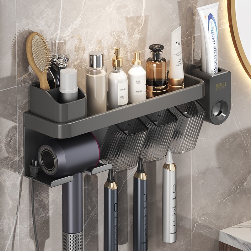 Suporte de Banheiro Multifuncional: Organize Tudo com Estilo 🧼 Se você quer transformar o seu banheiro de bagunçado para organizado (sem gastar muito!), esse suporte é a solução perfeita! Com design moderno e espaços versáteis, ele guarda todos os seus produtos de higiene e acessórios em um único lugar 😊 1. Espaço Generoso e Dividido ✅ Dimensões práticas (37x12cm): Acomoda cremes, shampoos, escovas e até secador de cabelo; ✅ Compartmentos específicos: Prateleira superior para produtos grandes (garrafas, potes); Suporte para secador de cabelo (com espaço para o cabo); Gavetas para escovas de dentes ou acessórios pequenos. 2. Funcionalidades que Facilitam a Vida ✅ Instalação fácil: Fixe na parede com adesivo forte (sem furos!) ou parafusos (para maior segurança); ✅ Resistente à umidade: Material plástico robusto que não oxida ou se danifica com água; ✅ Hooks extras: Ideal para colar toalhas de rosto, esponjas ou pulseiras. 3. Estilo que Combina com Qualquer Decoração ✅ Cor neutra (cinza): Se adapta a banheiros modernos, clássicos ou rústicos; ✅ Design compacto: Não ocupa espaço da bancada, liberando área para outros usos; ✅ Fácil de limpar: Basta passar um pano úmido para manter o suporte limpo e organizado. Se você quer um banheiro mais funcional e bonito, esse suporte multifuncional é indispensável! Ele resolve a falta de espaço e deixando o ambiente mais agradável.