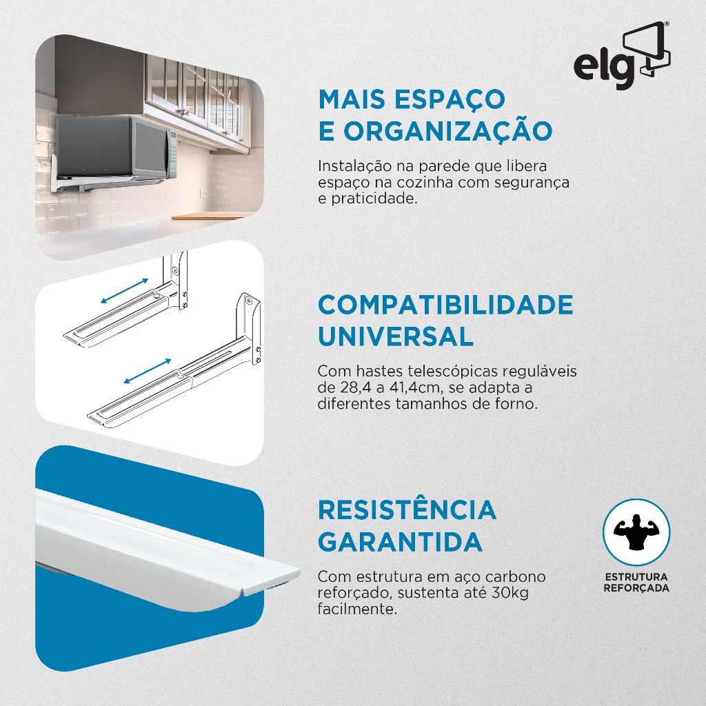 Qualidade, segurança e inovação que você só encontra na ELG, líder da categoria. O Suporte de Parede para Fornos e Micro-ondas MW05WH é a solução ideal para organizar e aproveitar melhor os espaços da sua cozinha de forma prática e segura. Com um design discreto e perfil slim, ele se integra perfeitamente ao ambiente. Fabricado em aço carbono reforçado com pintura epóxi, este suporte para micro-ondas garante alta resistência e suporta até 30kg. As hastes telescópicas permitem o ajuste de profundidade (de 28,4 a 41,4 cm), tornando-o compatível com a maioria dos fornos e micro-ondas do mercado. A instalação é extremamente simples, pois o suporte já vem montado e acompanha um gabarito para furação, garantindo uma montagem rápida e perfeitamente alinhada. Na embalagem você recebe o par de suportes (bases de parede, fixas e telescópicas), 1 kit de ferragens para instalação e 1 gabarito, tudo para otimizar seu espaço com segurança e estilo. Características Técnicas Tipo: Suporte de Parede para Forno/Micro-ondas Carga máxima: 30kg Ajuste de profundidade: Hastes telescópicas de 28,4 a 41,4cm Material: Aço carbono reforçado Pintura: Epóxi eletrostática Cor: Branco Extras: Perfil ultra slim, já vem montado, instalação em 3 passos, acompanha gabarito para furação. IMPORTANTE :: As imagens dos produtos são meramente ilustrativas e podem apresentar pequenas variações de cor ou acabamento, conforme iluminação, resolução do monitor ou percepção visual. :: Objetos de decoração e itens adicionais exibidos nas fotos não acompanham o produto. :: Todas as informações técnicas e características dos produtos são de responsabilidade da marca ELG, podendo sofrer alterações sem aviso prévio. :: Os pedidos são sempre enviados de forma completa. Caso haja produtos com prazos de postagem diferentes, será considerado o maior prazo para envio do pedido. :: Valores e condições podem ser alterados sem aviso prévio e são válidos exclusivamente para compras realizadas neste site. :: A garantia ELG é limitada ao produto e não cobre danos ocasionados por mau uso, instalação incorreta ou manuseio inadequado. SOBRE A ELG: A ELG é uma empresa brasileira que preza pela alta qualidade. Nossa política é aplicada em toda linha de produtos e garante que os consumidores possam adquirir itens que foram amplamente testados.
