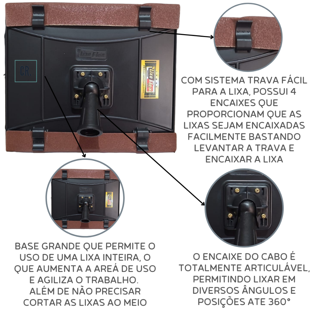 Suporte Para Lixar Lixador de Tetos e Paredes Lixa Flex Sem Escada Ou Andaimes Oferta! A Lixadeira Manual Lixa Flex é um produto inovador e revolucionário que dispensa a utilização de escadas ou andaimes. Com essa lixadeira manual você vai aumentar a produtividade e economizar tempo. Produzido em polipropileno e com base revestida com borracha EVA, possui design moderno com mecanismo articulável e cabo esférico rotativo possibilitando mobilidade para lixamento de tetos e paredes, cantos e locais de difícil acesso. Praticidade: Devido as garras flexíveis a lixa é colocada e removida facilmente quando necessário a substituição da mesma. Durabilidade: Suporte LixaFlex é resistente e durável devido a propriedade do material (Polipropileno) e base revestida com borracha EVA. Design: Moderno e cabo anatômico que possibilita mobilidade para o lixamento. Rendimento: Sistema operacional com ganhos produtivos superiores á 200% com uso do facilitador LixaFlex que possibilita maior aproveitamento da LIXA (padrão comercial), e a folha é usada inteira na base do dispositivo proporcionando contato em vasta área de atuação com ótimo acabamento nos processos de lixamento. Características - Fácil manuseio - Grande rentabilidade - Dispensa uso de escadas - Diminui contato com poeiras e resíduos - Proporciona conforto postural durante o trabalho - Utiliza lixa uma folha de lixa inteira vendida separadamente - Pode-se utilizar cabo de vassoura com rosca - Tamanho da base: 22 x 19cm ATENÇÃO!! - IMAGENS MERAMENTE ILUSTRATIVAS; - ANUNCIO REFERENTE AO KIT A SER ESCOLHIDO PELO CLIENTE DE ACORDO AS OPÇÕES; COMERCIAL CASA RIOS. - Conheça todos os nossos produtos clicando no icone "Ver Loja" logo ao lado do nome da loja. - Todos os nossos pedidos são enviados com Nota Fiscal. - Fornecemos apenas produtos originais, novos e lacrados na indústria. - Atendimento técnico , contate-nos se houver alguma dúvida. - Veja nossas avaliações - Confira nossos produtos - Compra 100% segura - Dúvidas? Pergunte, temos prazer em responder.