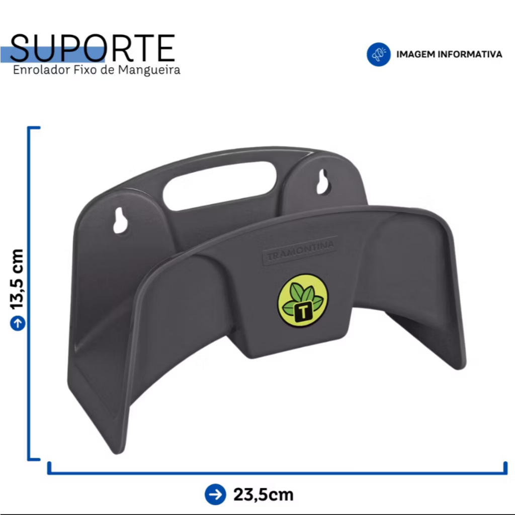 Suporte Fixo Tramontina em Plástico para Mangueira Se você tem problemas em guardar a mangueira dentro da garagem, o suporte fixo Tramontina em plástico para mangueira é ideal para você. O produto pode ser fixado em qualquer parede sem ocupar muito espaço do ambiente. Praticidade e agilidade para desempenhar seu trabalho, só com a Tramontina. --- Características: - Fabricado em polipropileno de alta resistência, proporcionando maior durabilidade e ótimo acabamento. - O suporte, além de guardar a mangueira do modo mais correto, ajuda na organização do espaço. - Capacidade de armazenamento de até 30 metros de mangueira \(1/2^u\). Este é apenas um valor de referência, considerando uma mangueira de \(1/2^u\). O valor pode variar para mais ou para menos, dependendo do modelo e do diâmetro da mangueira. - Cor do suporte: Cinza --- Informações Complementares: - O suporte fixo permite o armazenamento de até 35 metros de mangueira de \(1/2^u\). - Água: pode faltar. Não desperdice. - Para descarte dos produtos e embalagens siga as orientações de reciclagem vigentes. --- ## Informações Técnicas: Peso Líquido: 0,120 kg. Dimensões Embalagem (Compr. X Larg. X Alt.): 23,5cm x 13cm x 13,5cm