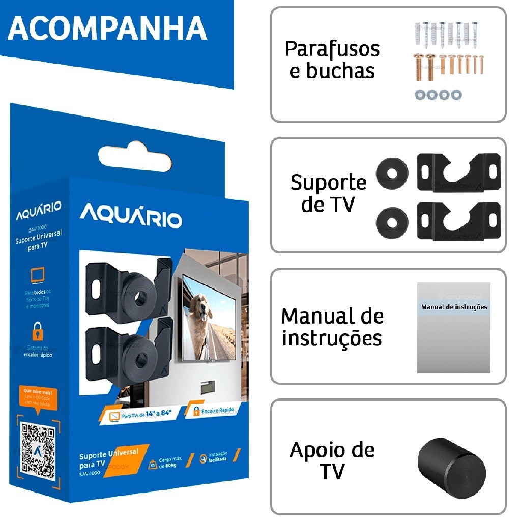 SUPORTE FIXO UNIVERSAL PARA TV E MONITOR 14” A 84” | ATÉ 80KG | MODELO AÇO REFORÇADO O Suporte Fixo para TV é a escolha ideal para quem busca praticidade, segurança e um visual mais limpo no ambiente! Compatível com televisores de 14 a 84 polegadas, ele suporta até 80kg, sendo perfeito para modelos LED, LCD, Plasma e Smart TVs. Feito em ferro de alta resistência, o suporte é fácil de instalar e garante total firmeza na parede. Certificado com padrão VESA, proporciona encaixe preciso e estável, trazendo mais confiança na hora da montagem. Ideal para salas, quartos, áreas externas ou comerciais. ⸻ BENEFÍCIOS DO PRODUTO: -Compatível com TVs de 14” até 84” -Suporta até 80kg -Padrão VESA universal -Instalação simples e rápida -Acompanha gabarito de instalação -Ideal para deixar o ambiente mais organizado e moderno -Aço resistente e durável -Excelente custo-benefício ⸻ CONTEÚDO DA EMBALAGEM: 01 Par de suportes de ferro 01 Base inferior de plástico com fixação 01 Kit com parafusos, buchas e arruelas 01 Manual de instruções (em português, no verso da embalagem) 01 Gabarito de instalação