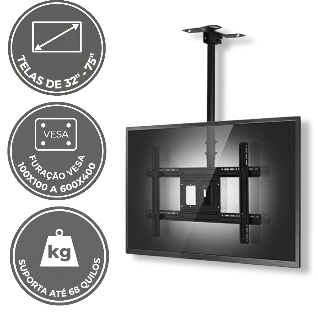 GT1030: Suporte De Teto Altura Regulável Maximize a visibilidade e otimize o espaço do seu ambiente com este Suporte Premium. Fabricado em Aço (Laminado a Frio), ele oferece segurança máxima para TVs de médio e grande porte. Seu grande diferencial é a haste telescópica que permite ajustar a altura da TV de 75cm até 1,5 metros do teto, adaptando-se facilmente. ESPECIFICAÇÕES TÉCNICAS Compatibilidade de Tela: 32" a 75" polegadas. Local de Instalação: Teto ou Parede. Padrão VESA: De 100x100 até 600x400mm (Compatível com a maioria das TVs do mercado). Material: Aço Carbono SPCC de alta resistência. Peso Aprox. do Produto: ~5kg (Estrutura robusta). AMPLITUDE DE MOVIMENTOS: °Giro no Teto: 160°. °Inclinação Vertical: 15°. °Rotação da Tela: 60° (Ajuste lateral/nível). °Extensão do Mastro: Mínimo 750mm / Máximo 1500mm. °Acabamento Premium: Tratamento de superfície em Pintura Eletrostática. POR QUE ESCOLHER ESTE SUPORTE DE TETO? °Versatilidade: Diferente dos suportes apenas de parede, este modelo permite instalar a TV no meio da sala, no pé da cama. No teto ou na parede. °Organização: Permite a passagem de cabos por dentro do tubo, mantendo o visual limpo. °Ajuste Preciso: Com a variação de altura de quase 750 a 1500mm, você garante que a TV fique na altura exata dos olhos, seja em um bar alto ou em uma sala de estar baixa. °Segurança SPCC: Construído com aço de especificação industrial, garantindo que sua TV de 70" fique suspensa com total estabilidade. CONTEÚDO DA EMBALAGEM: - 01 Suporte de Teto Telescópico. - 01 Kit de Parafusos e Buchas para fixação no teto e na TV. - 01 Manual de Instruções (Montagem passo-a-passo). Dica rápida: ° Antes de comprar, verifique o padrão VESA da sua TV — garantir medida compatível. Segurança e Garantia: ° Compra 100% segura com nota fiscal e garantia de 90 dias contra defeitos de fabricação. Satisfação garantida — ou devolução gratuita em até 7 dias. Garantia do vendedor: 90 dias