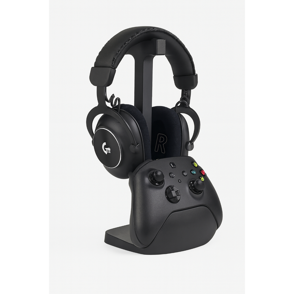 SUPORTE DE MESA PARA 1 CONTROLE DE XBOX ONE S/X + SUPORTE PARA FONE/HEADSET/HEADPHONE Descrição: Este suporte foi projetado para acomodar perfeitamente 1 controle de Xbox (compatível com os modelos One, S e X) e também fones de ouvido, headsets ou headphones. Ideal para organizar seu setup, trazendo mais ordem e estilo ao ambiente. Seu design é livre de saliências ou pontas, garantindo segurança total para seus dispositivos. ATENÇÃO: CONTROLE E FONE NÃO INCLUSOS. INFORMAÇÕES TÉCNICAS: Dimensões: Altura: 24,5 cm | Largura: 12,0 cm | Profundidade: 14,5 cm Material: Plástico PLA — leve, resistente e ecológico.