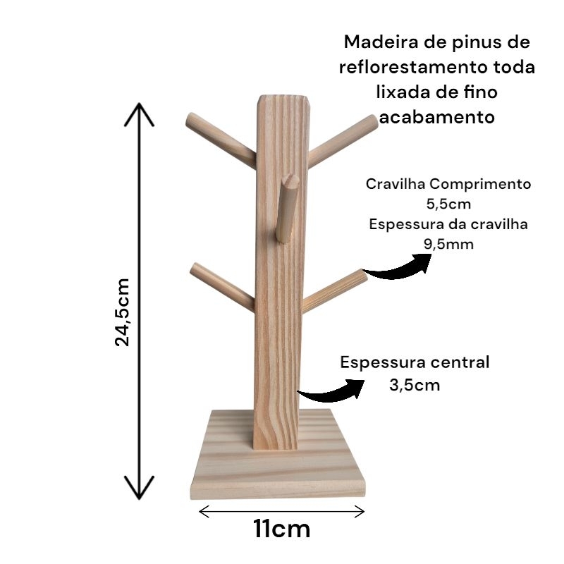 SUPORTE MANCEBO MADEIRA PINUS ❌️NÃO ACOMPANHA XICARAS ❌️NÃO SÃO INVERNIZADOS Esse é o produto ideal para decorar o seu tão especial cantinho do café ou até mesmo presentear uma pessoa querida, além da beleza o porta xícaras é feito em madeira de pinus que é muito resistente, ideal até 6 xícaras/canecas de 120mL. Com esse porta xícaras você vai conseguir deixar seus armários muito mais organizados. Medidas Suporte: Altura: 24,5 cm Base: 12x12 Peso: 300 gr Material de composição: madeira de pinus PERGUNTAS FREQUENTES: - SUPORTA ATÉ QUANTAS XICARAS DE QUANTOS mL? Resp: 6 xicaras de até 120ml - TEM A PRONTA ENTREGA? Resp: Sim, todos os nossos produtos anunciados são a pronta entrega e eviamos em até 24hs úteis Quem somos? Somos uma loja virtual em busca de satisfazer ao máximo o cliente trabalhando dentro das maiores lojas online do Brasil com grande variedade de produtos originais e de ótima qualidade.