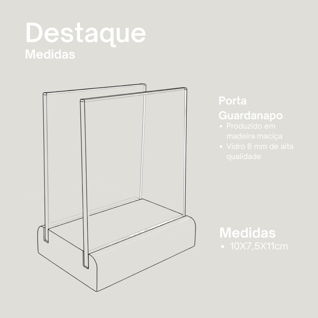 Porta Guardanapos Seiva Clean O Porta Guardanapos Seiva Clean é a escolha ideal para adicionar um toque de elegância, sofisticação e praticidade à sua mesa. Produzido em madeira nobre e vidro de 6mm com lapidação industrial, ele une resistência, acabamento refinado e um visual contemporâneo que valoriza qualquer ambiente. Perfeito para restaurantes, buffets, lanchonetes ou até mesmo para uso residencial, esse suporte mantém os guardanapos sempre organizados e ao alcance das mãos. Seu acabamento em vidro e madeira nobre traz um charme especial, tornando a peça não apenas funcional, mas também decorativa e de alto padrão. O design compacto e moderno se adapta facilmente a mesas de diversos tamanhos, garantindo durabilidade, fácil limpeza e um toque sofisticado na decoração. Especificações Técnicas: • Modelo: Porta Guardanapos Seiva Clean• Material: Madeira nobre, vidro 6mm com lapidação industrial• Cor: Vidro 6mm com detalhes em madeira natural• Design: Moderno, compacto e sofisticado• Ambientes recomendados: Mesa de restaurante, buffet, lanchonete, casa• Uso: Suporte para manter os guardanapos organizados e ao alcance• Facilidade de limpeza: Resistente e fácil de limpar Medidas do produto: • Comprimento (C): 10cm• Largura (L): 8cm• Altura (A): 11cm Perguntas Frequentes (FAQ): 1. O suporte é adequado para uso em ambientes comerciais? Sim, o design sofisticado e os materiais de alta durabilidade tornam o produto ideal para restaurantes, buffets e lanchonetes. 2. Posso usar o suporte para guardanapos de diferentes tamanhos? Sim, o Porta Guardanapos Seiva Clean acomoda diversos tamanhos de guardanapos, mantendo-os sempre organizados. 3. Como faço a limpeza do porta guardanapos? Limpe facilmente com pano e limpa vidro. Evite produtos abrasivos para preservar o brilho do vidro e o acabamento da madeira. Conteúdo da Embalagem: • 01 Porta Guardanapos Seiva Clean Importante: • Guardanapos não inclusos