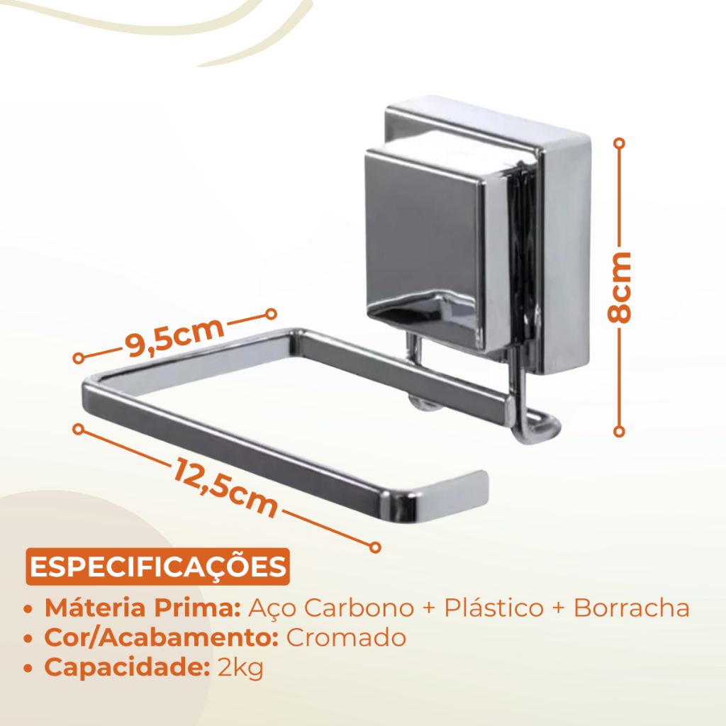 SOBRE O PRODUTO Suporte para Papel Higiênico fabricado em aço carbono com acabamento brilhante. Possui instalação prática, rápida e sem sujeira, graças ao sistema de fixação com ventosas Future. Pode ser fixado e removido com facilidade. Posicione no melhor local no banheiro ou no lavabo. Além do tradicional tratamento superficial da Future - onde são aplicadas até 4 camadas de metal - os produtos são revestidos com uma camada extra do protetivo especial Rust Free, garantindo cores vivas e brilhantes, além de maior resistência contra ferrugem. Itens inclusos: 1 Suporte com ventosa INSTALAÇÃO - Correto: superfícies lisas, brilhantes e totalmente planas como vidros, espelhos, azulejos, cerâmicas não porosa, pinturas lisas e brilhantes (epóxil) e laminados.- Incorreto: superfícies curvas, foscas ou porosas como papel de parede, madeira, parede de cimento, mármore, granito, etc. RECOMENDAÇÕES DO PRODUTO - Remover regularmente (a cada 3 meses) e reaplicar conforme instruções de montagem.- Nunca utilize este produto com pesos superiores ao indicado na embalagem.- Não utilize este produto para acomodar produtos frágeis e de valor.- Não use chaves, facas e objetos pontiagudos para retirar o produto da superfície. MEDIDAS - Profundidade: 9,5cm - Lagura: 12,5cm - Altura: 8cm - Peso: 0,14kg ESPECIFICAÇÕES DO PRODUTO: - Máteria Prima: Aço Carbono + Plástico + Borracha - Cor/Acabamento: Cromado - Capacidade: 2kg
