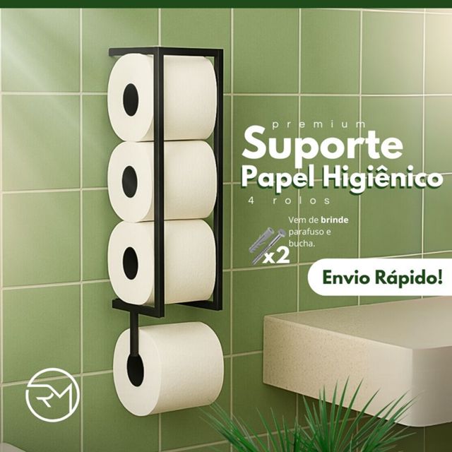 Por que escolher: ✅ Design moderno e durável — não enferruja facilmente ✅ Instalação simples — kit completo incluso ✅ Combina com qualquer decoração Especificações: Material: Aço carbono Cor: Preto fosco Capacidade: 4 rolos Medidas: 42×15×10 cm | Peso: 600 g Cuidados: Limpe com pano úmido e sabão neutro. Evite produtos abrasivos para manter o brilho. ✨ Banheiro mais organizado, bonito e funcional em minutos! Estamos disponíveis via chat para resolver qualquer problema!