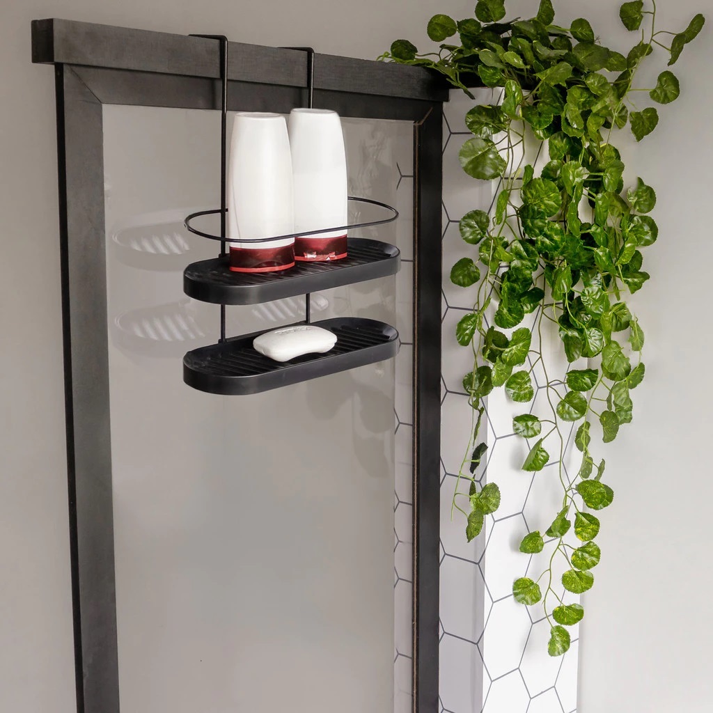 Suporte De Box Banheiro Para Shampoo E Sabonete Duplo Aramado Preto = - Material: Hastes em Aço com pintura termo plastificado (não enferruja, não descasca em contato com a Água e umidade) Base Em plástico Reforçado. Dimensões: - Altura: 43cm - Largura: 24,5cm - Profundidade: 10cm - Diâmetro Do Encaixe no Box: 05cm (obs:. Encaixe compatível para Box de Base Quadrada , para Box de Base Arredondada não será compatível o encaixe) - Diâmetro (interno) das Prateleiras: 09cm - Peso: 300g Porta Shampoo é ideal para organização, otimizando o espaço do banheiro e deixando os produtos de banho ao alcance das mãos. Produzido em aço termo plastificado não enferruja ao contato com a água e sua instalação é de simples entendimento, não precisa furar paredes.