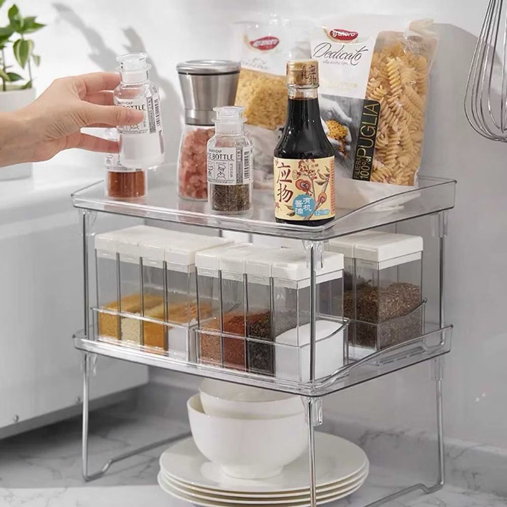 PRODUTOS A PRONTA ENTREGA! Suporte Prateleira Organizador De Plastico / Aramado Retangular Empilhavel COR: TRANSPARENTE E PRATA MATERIAL: PLASTICO / ARAMADO
