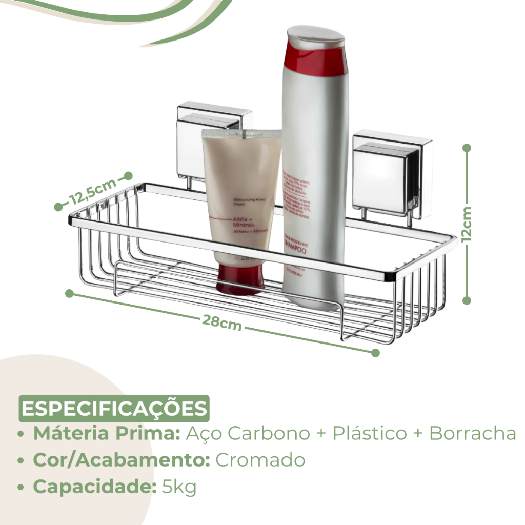 SOBRE O PRODUTO O Suporte de Shampoo com fixação por ventosas pode ser utilizado no box com shampoos e condicionadores mas também próximo à pia do banheiro, com seus cremes hidratantes e demais itens de beleza. Sofisticação através do detalhe em aço Piatina (em formato achatado). O aço Piatina dá o toque especial que o banheiro e o lavabo merecem. Além do tradicional tratamento superficial da Future - onde são aplicadas até 4 camadas de metal - os produtos são revestidos com uma camada extra do protetivo especial Rust Free, garantindo cores vivas e brilhantes, além de maior resistência contra ferrugem. Itens inclusos: 1 Suporte Porta Shampoo com ventosa INSTALAÇÃO - Correto: superfícies lisas, brilhantes e totalmente planas como vidros, espelhos, azulejos, cerâmicas não porosa, pinturas lisas e brilhantes (epóxil) e laminados. - Incorreto: superfícies curvas, foscas ou porosas como papel de parede, madeira, parede de cimento, mármore, granito, etc. RECOMENDAÇÕES - Remover regularmente (a cada 3 meses) e reaplicar conforme instruções de montagem. - Nunca utilize este produto com pesos superiores ao indicado na embalagem. - Não utilize este produto para acomodar produtos frágeis e de valor. - Não use chaves, facas e objetos pontiagudos para retirar o produto da superfície. MEDIDAS - Profundidade: 12,5cm - Lagura: 28cm - Altura:12cm - Peso: 0,47kg ESPECIFICAÇÕES - Máteria Prima: Aço Carbono + Plástico + Borracha - Cor/Acabamento: Cromado - Capacidade: 5kg