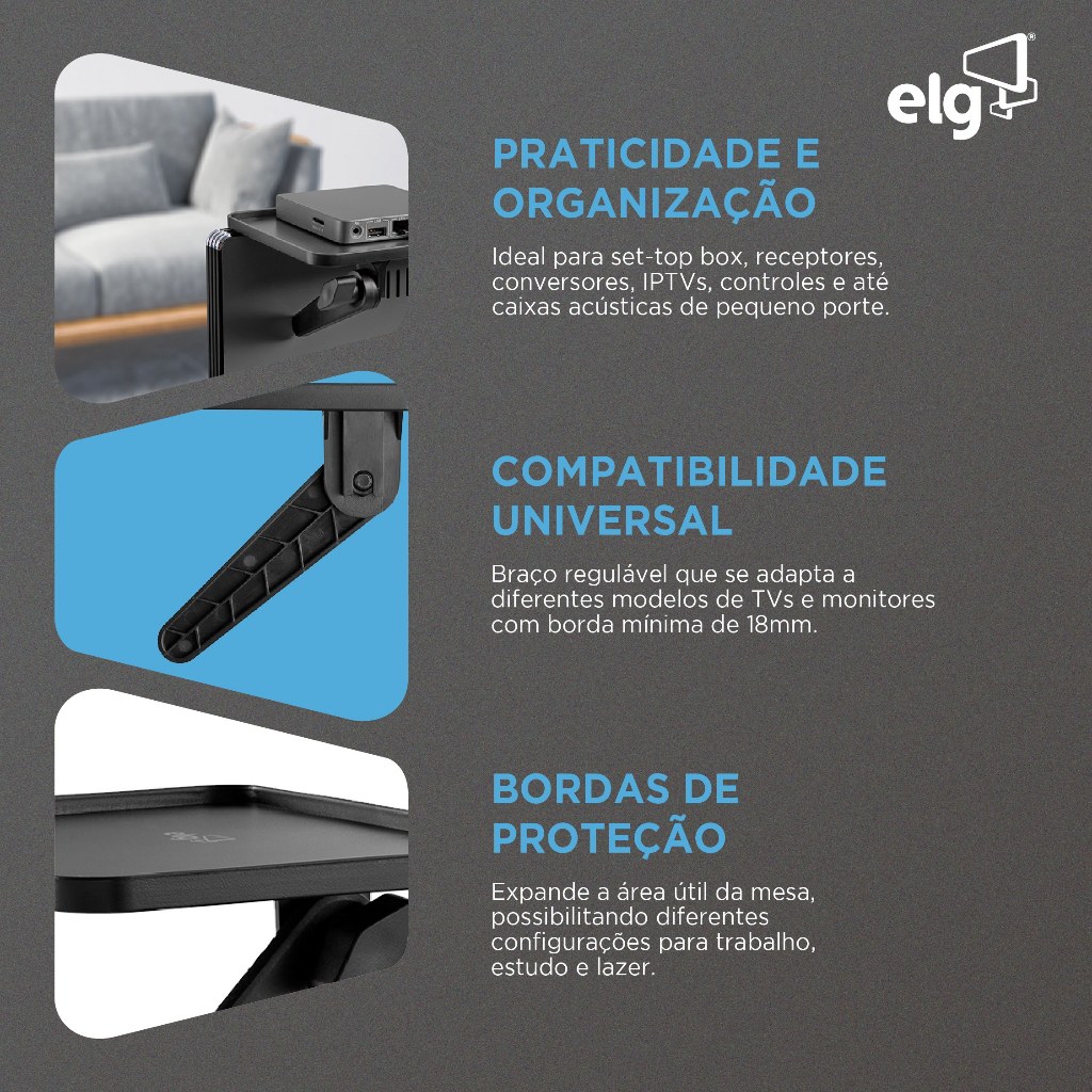 Qualidade, segurança e inovação que você só encontra na ELG, líder da categoria. O suporte prateleira para TV ELG ACE08S é a solução inteligente e compacta para organizar e apoiar dispositivos acima do seu televisor. Ideal para set-top box, controles remotos, receptores, conversores digitais ou outros itens pequenos, ele otimiza seu espaço com máxima praticidade. Com estrutura em plástico reforçado, o suporte aguenta até 6kg. Sua superfície de 18 x 12,7 cm conta com bordas de proteção antiqueda, garantindo que seus aparelhos fiquem sempre seguros. Prático e versátil, este organizador para TV não requer ferramentas para montagem. O sistema de braço regulável o torna compatível com diversos modelos de televisores, bastando que a TV tenha uma borda superior de no mínimo 1,8 cm para apoio. Na embalagem você recebe 1 Suporte tipo prateleira, pronto para organizar seu espaço em segundos. Características Técnicas Tipo: Prateleira superior para TV/Monitor Carga máxima: 6kg Dimensões da superfície: 180 x 127mm (Largura x Profundidade) Material: Plástico reforçado Compatibilidade: TVs com borda superior mínima de 18mm e distância da parede mínima de 127mm Cor: Preto Extras: Instalação sem ferramentas, braço regulável, bordas de proteção antiqueda. IMPORTANTE :: As imagens dos produtos são meramente ilustrativas e podem apresentar pequenas variações de cor ou acabamento, conforme iluminação, resolução do monitor ou percepção visual. :: Objetos de decoração e itens adicionais exibidos nas fotos não acompanham o produto. :: Todas as informações técnicas e características dos produtos são de responsabilidade da marca ELG, podendo sofrer alterações sem aviso prévio. :: Os pedidos são sempre enviados de forma completa. Caso haja produtos com prazos de postagem diferentes, será considerado o maior prazo para envio do pedido. :: Valores e condições podem ser alterados sem aviso prévio e são válidos exclusivamente para compras realizadas neste site. :: A garantia ELG é limitada ao produto e não cobre danos ocasionados por mau uso, instalação incorreta ou manuseio inadequado. SOBRE A ELG: A ELG é uma empresa brasileira que preza pela alta qualidade. Nossa política é aplicada em toda linha de produtos e garante que os consumidores possam adquirir itens que foram amplamente testados.