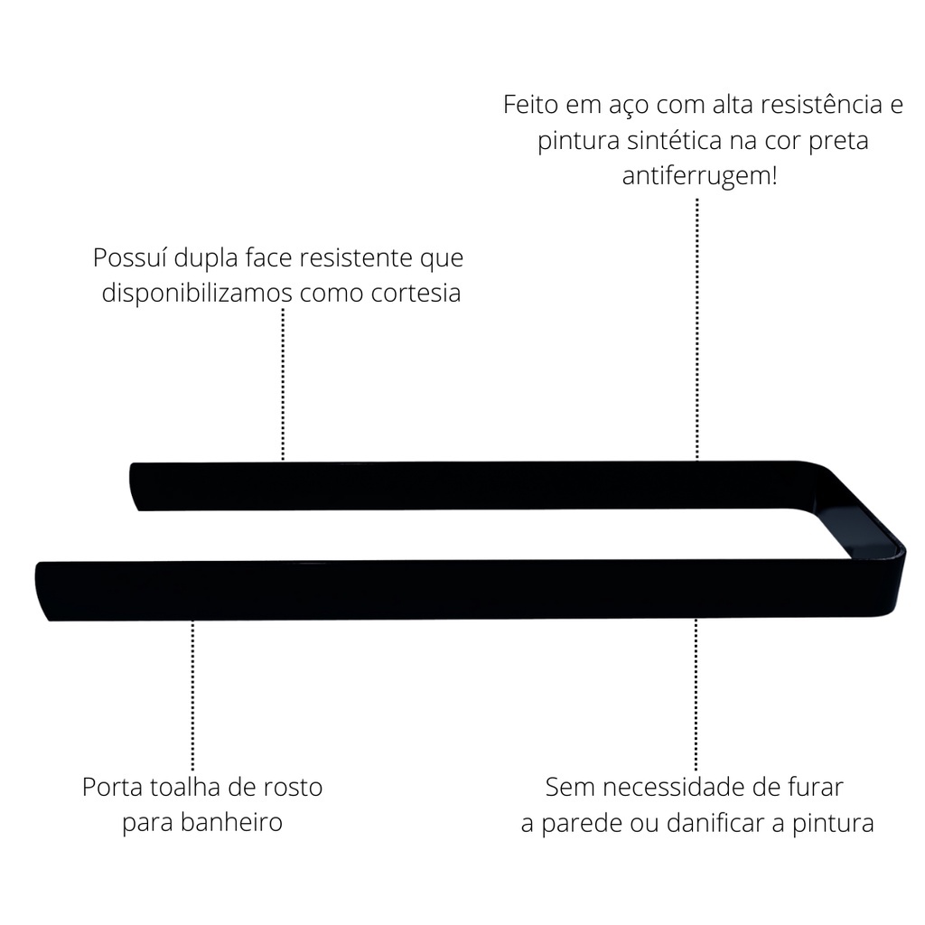 Porta toalha de rosto para banheiro que não precisa furar, apenas colar no local desejado, dessa forma não danifica sua parede e ainda facilita a instalação. JA INCLUSO DUPLA FACE COMO CORTESIA!! Instalação: Extremamente fácil ! Feito em aço com alta resistência e pintura sintética antiferrugem! * FABRICADO NO BRASIL A PRONTA ENTREGA * Dimensões: 18cm de comprimento Cor: Preto Fosco Aplicação: Superfície lisa. INCLUSO FITA DUPLA FACE JÁ NO PRODUTO! Estamos a disposição para qualquer dúvida, Boas compras!