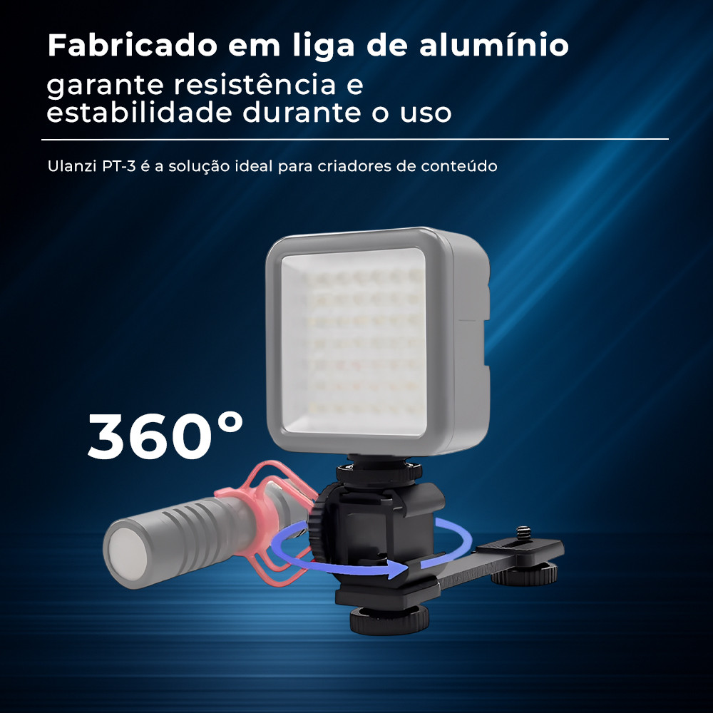 Suporte Triplo Cold Shoe Ulanzi PT-3 em Alumínio, Compatível com Gimbals Zhiyun, DJI, FeiyuTech e Câmeras, Montagem de Microfone, Luz LED e Acessórios com Rosca 1/4"-20 1. O suporte triplo cold shoe Ulanzi PT-3 permite adicionar até três acessórios ao seu gimbal ou câmera em um único equipamento, ideal para microfones, luzes LED e outros dispositivos. Compatível com gimbals como Zhiyun Smooth 4/Smooth Q, DJI Osmo Mobile 2 e FeiyuTech Vimble 2, ou qualquer equipamento com rosca inferior de 1/4"-20. 2. Fabricado em liga de alumínio durável e leve, garante resistência e estabilidade durante o uso. Sua construção robusta suporta gravações intensas, oferecendo segurança para seus acessórios mesmo em movimento. 3. O braço de extensão de 4,1" possui três sapatas frias removíveis, permitindo adaptar o suporte para diferentes configurações. Ao retirar a sapata fria, o braço pode ser usado como suporte de acessório com rosca 1/4"-20. 4. A fixação é feita por meio de botão giratório de 1/4"-20, garantindo encaixe rápido e firme. É possível instalar um mini tripé na parte inferior, aumentando a estabilidade e facilitando gravações em diferentes ângulos. 5. Compacto, funcional e versátil, o Ulanzi PT-3 é a solução ideal para criadores de conteúdo que precisam montar múltiplos acessórios no mesmo equipamento, otimizando o setup e proporcionando mais recursos para filmagens. Garantia 90 dias.