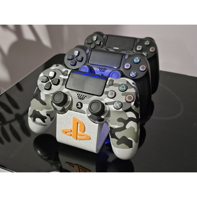 🎮Suporte triplo IDEAL para controles PS4, também compativel com PS5, organize até 3 em um só suporte. Material de excelente acabamento de estrutura e cor em PLA. Todas as variações de controles levam a logo estampada no suporte. 20X6X6 (comprimento, altura, largura)