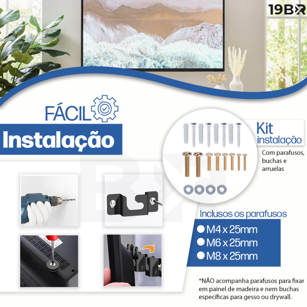 O Suporte TV é o acessório ideal para você que deseja espaço e organização na sua casa. Suporta até 80kg e você pode instalar com praticidade sua TV na parede. Indicado para aparelhos de TV entre 10 à 84 polegadas. Compatível com os padrões VESA e possui garantia! Informações adicionais: - Suporte Fixo Universal - Fácil Instalação - Suporta 80 kg - Para TV LED/LCD 10” a 84” - Possui trava de segurança - Suporte fixo com tamanho padrão, que deixa a TV em uma distância de cerca de 3cm da parede. - Tipo de parafuso para parede: 1/4" x 40 - Acompanha buchas 8mm - Tipos de parafusos inclusos para TV: M4 x 25mm M6 x 25mm M8 x 25mm * Os 3 modelos de parafusos acima fornecidos pelo fabricante, são compatíveis com a grande maioria das TV's Conteúdo do kit composto para uma TV: 01 - Par de suportes de ferro 01 - Base inferior de plástico com fixação 01 - Kit de parafusos, buchas e arruelas para fixar na parede e TV 01 - Manual de instruções em português no verso da embalagem 01- ACOMPANHA GABARITO DE INSTALAÇÃO ATENÇÃO: *NÃO acompanha parafusos para fixar em painel de madeira. *NÃO acompanha buchas específicas para gesso ou drywall. Compatível com as principais marcas de TV do mercado: Samsung, LG, Philco, Phillips, Sony, Toshiba, Panasonic, AOC, CCE, TCL, Multilaser entre outras. VIDEO DE INSTALAÇÃO DISPONIVEL !!! Garantia do vendedor: 36 meses