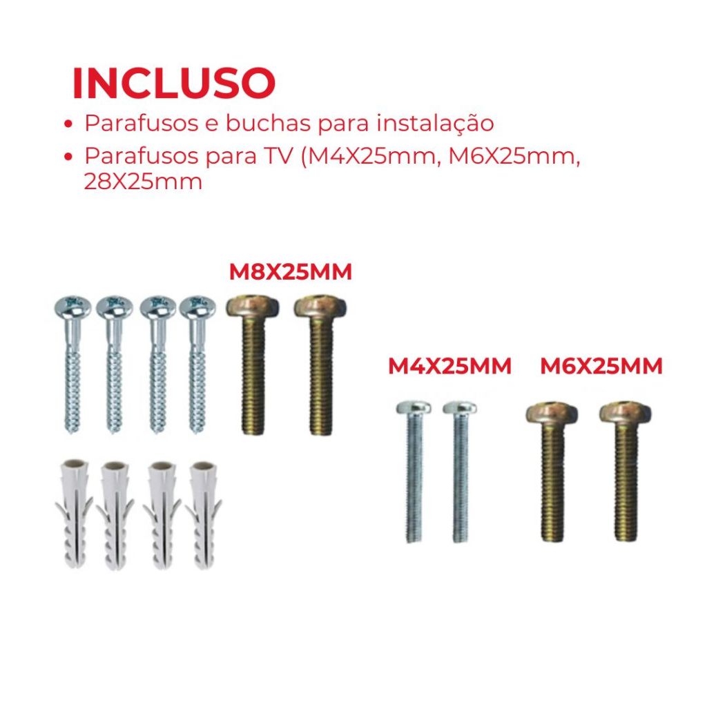 Suporte Para Televisão Universal Fixo LED LCD Plasma 10 até 90’’ Polegadas para Parede ou Painel O Suporte Universal Brasforma possui design inovador e inteligente, pois é universal, sendo compatível com qualquer modelo de TV. Todos os suportes Brasforma são testados com o dobro de carga para que você assista á sua TV com máxima segurança. Características do Produto: Pintura em epóxi Proteção Anticorrosiva Compatível Com Todas as Marcas de TV Feito em Aço Carbono Suporta Até 40kg Roldanas em Poliuretano Rígido Conteúdo da embalagem: 2 Suportes Superiores 2 Roldanas de poliuretano 1 Calço Inferior 2 Parafusos M4X25mm 2 Parafusos M6X25mm 2 Parafusos M8X25mm 4 Parafusos para Bucha 1/4x40 4 Buchas Nº 8 2 Arruelas M6 ** ENVIO IMEDIATO**