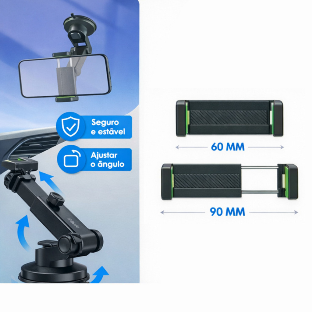 Suporte Universal para Celular com Ventosa para Carro Suporte para Celular com fixação mecânica no aparelho e base com ventosa, desenvolvido para uso em carro. Conta com ajuste de ângulo para melhor posicionamento durante o uso, oferecendo praticidade na instalação e no encaixe de diferentes tamanhos de Celular compatíveis. ESPECIFICAÇÕES GERAIS: - Material: ABS + Silicone - Compatibilidade: Celulares de 3.5 a 7 polegadas - Tipo de fixação no Celular: Fixação mecânica - Tipo de fixação na base: Ventosa - Aplicação: Carro, vidro, superfícies lisas - Características: Seguro, estável e com ajuste de ângulo CONTEÚDO DA EMBALAGEM: - 01 Suporte universal para Celular INFORMAÇÕES IMPORTANTES: - Produto compatível com diversos modelos de Celular dentro da faixa informada - Indicado para instalação em superfícies lisas - Verifique as medidas do seu aparelho antes da compra