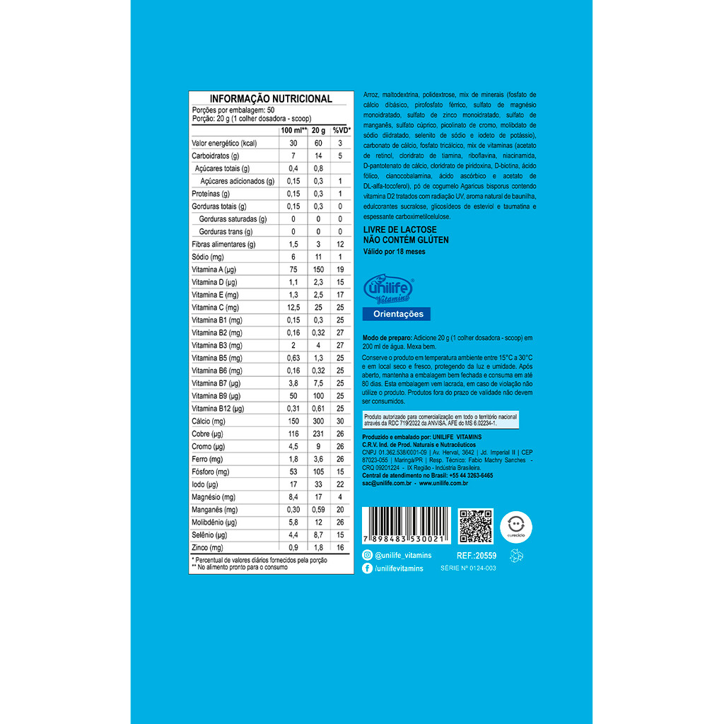 Supramil Bebida de Arroz Kids Unilife 1kg 📘 O que é o produto Supramil Bebida de Arroz Kids Unilife é um suplemento alimentar vegano em pó, produzido a partir de arroz, com sabor natural de baunilha. Livre de lactose, glúten e derivados conforme informado pelo fabricante. 🎯 Para que serve o produto Produto destinado à complementação alimentar infantil conforme descrição do fabricante. 📄 Informações sobre o produto Fórmula vegana Livre de lactose Livre de glúten Aroma e sabor natural de baunilha Vitaminas e minerais conforme rotulagem Produto solúvel em água Validade de 18 meses Conforme RDC 719/2022 📦 Conteúdo da embalagem 1 unidade contendo 1kg de bebida de arroz em pó 🥄 Como consumir Conforme orientações do fabricante: diluir 20g do produto em 200ml de água Armazenar em local fresco, seco e protegido da luz após aberto 🧪 Ingredientes Bebida de arroz em pó Vitaminas e minerais: cálcio, ferro, zinco, vitaminas A, C, D, B1, B2 e B6 Aroma natural de baunilha ⚠️ Alergênico Não contém lactose Não contém glúten Informado como livre de traços de alergênicos pelo fabricante 🏥 Ministério da Saúde adverte Este produto não é medicamento. 🆔 Cod. Anvisa Registro conforme RDC 719/2022