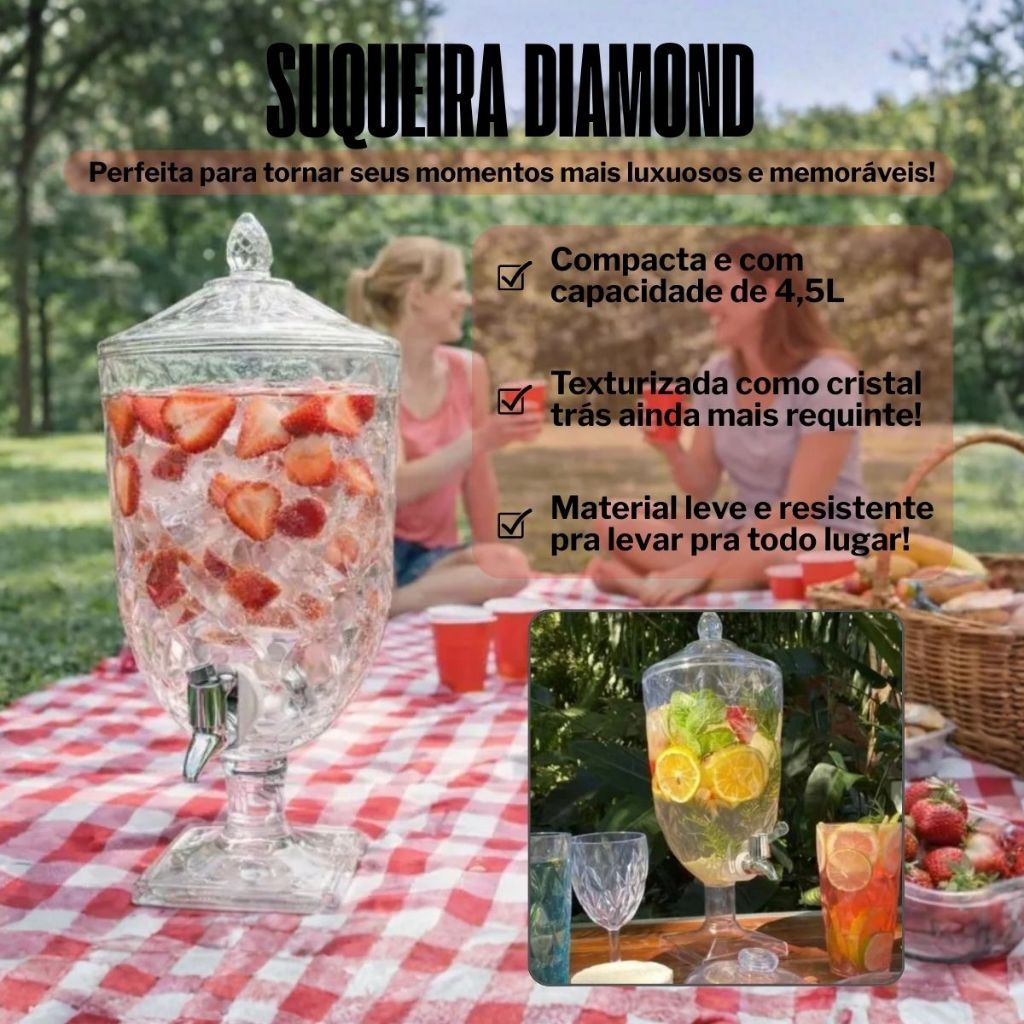 | Suqueira Dispenser De Vidro 5l Diamond Transparente Luxo Com Tornei... | R$ 129,90 | 46% | 4.9/5 | 124 |