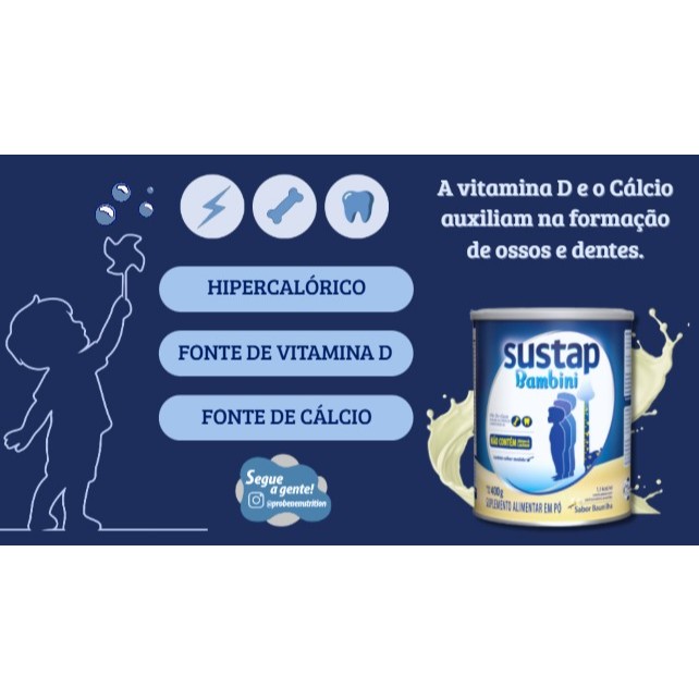 Descrição: O Sustap Bambini é um suplemento alimentar completo e balanceado, ideal para crianças e jovens (4 a 18 anos) que necessitam de um maior aporte energético. Fonte de vitamina D e cálcio, que auxiliam na formação e manutenção de ossos e dentes. Sabor: Baunilha. Lista de Ingredientes: Maltodextrina, proteína concentrada soro do leite para dietas com restrição de lactose, gordura de palma, polidextrose, carbonato de cálcio, óxido de magnésio, ácido ascórbico, nicotinamida, pirofosfato férrico, acetato de DL-alfa-tocoferol, sulfato de zinco monoidratado, D-pantotenato de cálcio, riboflavina, cloridrato de piridoxina, tiamina mononitrato, sulfato cúprico, acetato de retinol, ácido fólico, colecalciferol, iodeto de potássio, fitomenadiona, molibdato de sódio, cloreto de cromo (III), D-biotina, L-selenometionina, cianocobalamina, cloreto de sódio, aromatizante e emulsificante lecitina de soja. ALÉRGICOS: CONTÉM DERIVADOS DE LEITE E DE SOJA. NÃO CONTÉM LACTOSE. NÃO CONTÉM GLÚTEN. Modo de preparo: Para o preparo do Sustap Bambini a 1,5 kcal/ml, adicione 42,7 g (4 colheres-medida) do produto em 46 ml de água, mexa bem para homogeneizar o líquido. Adicione mais 50 ml de água e misture até completa homogeneização do produto. O volume final do produto reconstituído será de 112 ml. Para o preparo do Sustap Bambini a 1,0 kcal/ml, adicione 42,7 g (4 colheres-medida) do produto em 44 ml de água, mexa bem para homogeneizar o líquido. Adicione mais 100 ml de água e misture até completa homogeneização do produto. O volume final do produto reconstituído será de 168 ml. Sugestão de uso: Consumir uma porção de 42,7 g (4 colheres-medida) duas vezes ao dia (total 85,4 g) ou conforme orientação nutricional e/ou médica.